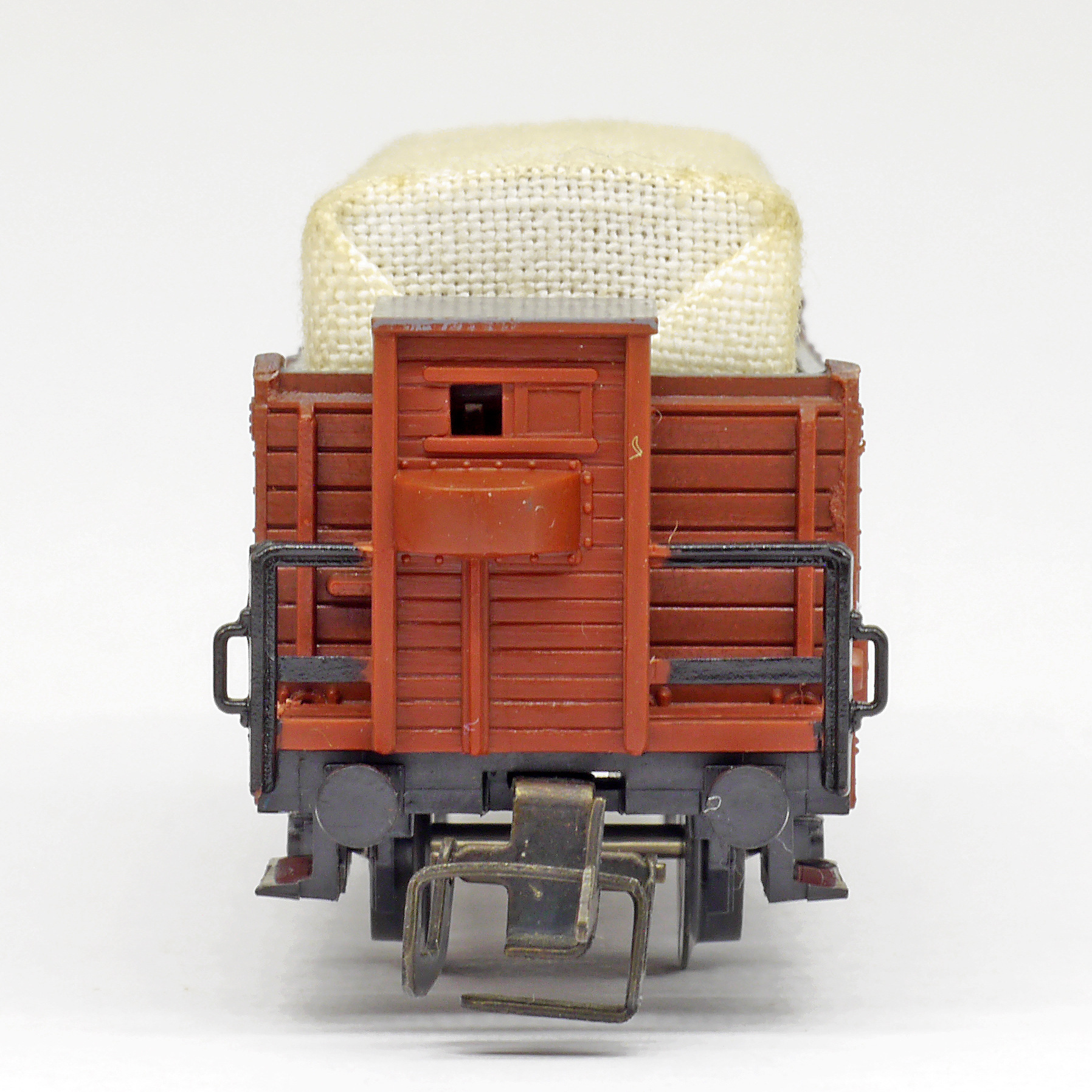 | otevřený nákladní vůz červenohnědý s brzdařskou budkou s plachtou |
