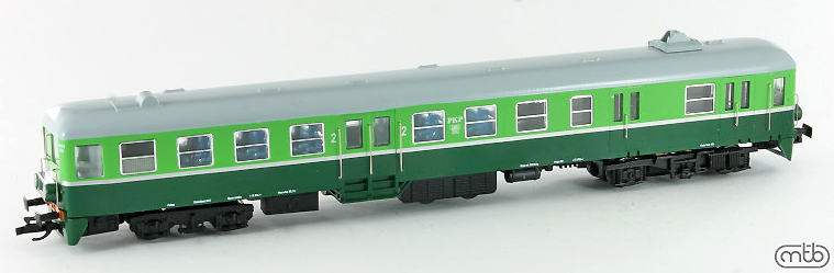 | motorový vůz tmavě zelený-světle zelený s šedou střechou, výstražný pruh na čelech |