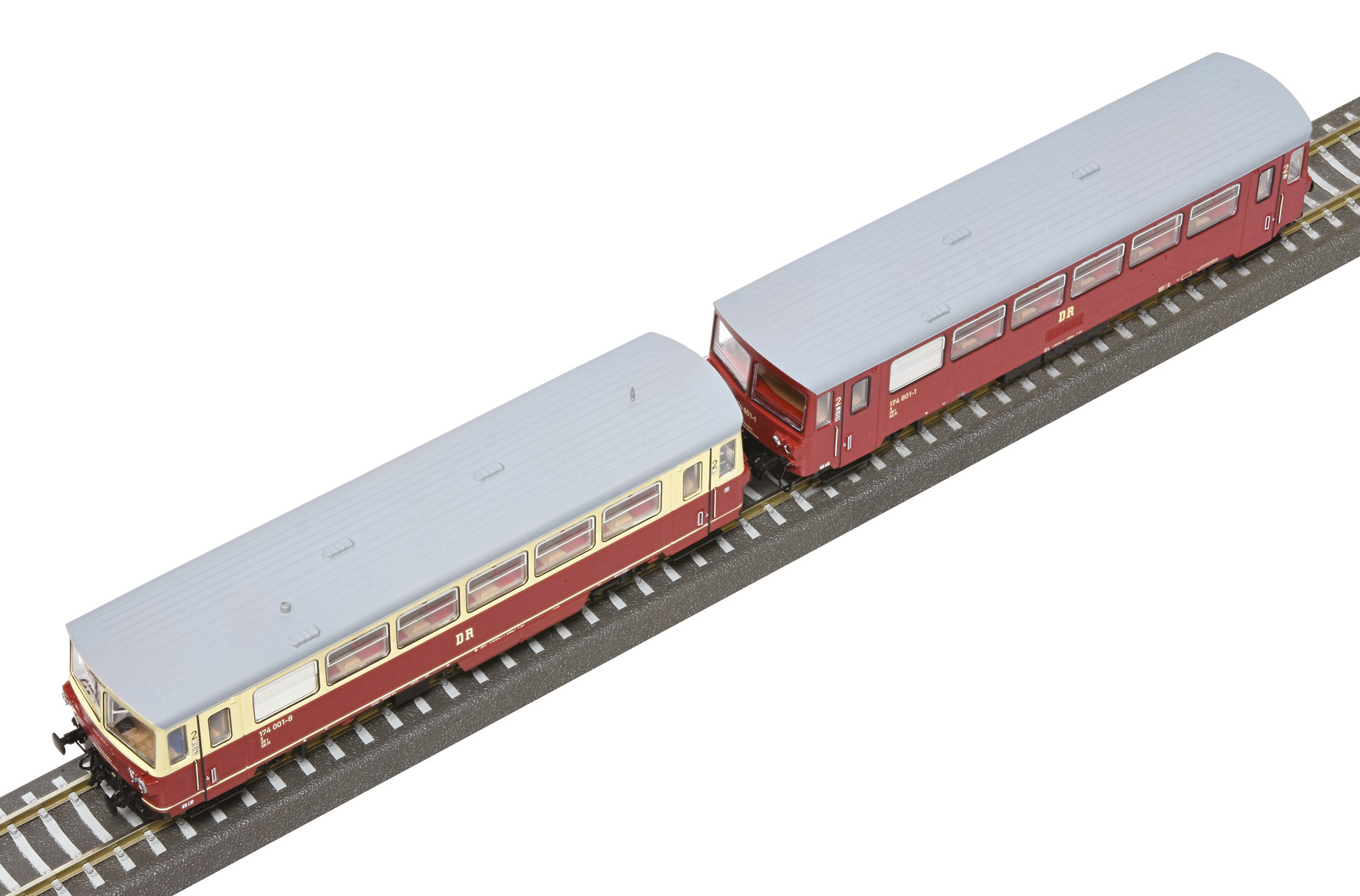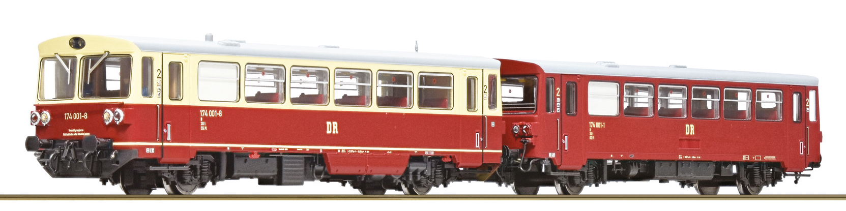 | motorový vůz v barvě červený-slonová kost s šedou střechou s přípojným vozem v červené barvě s šedou střechou |