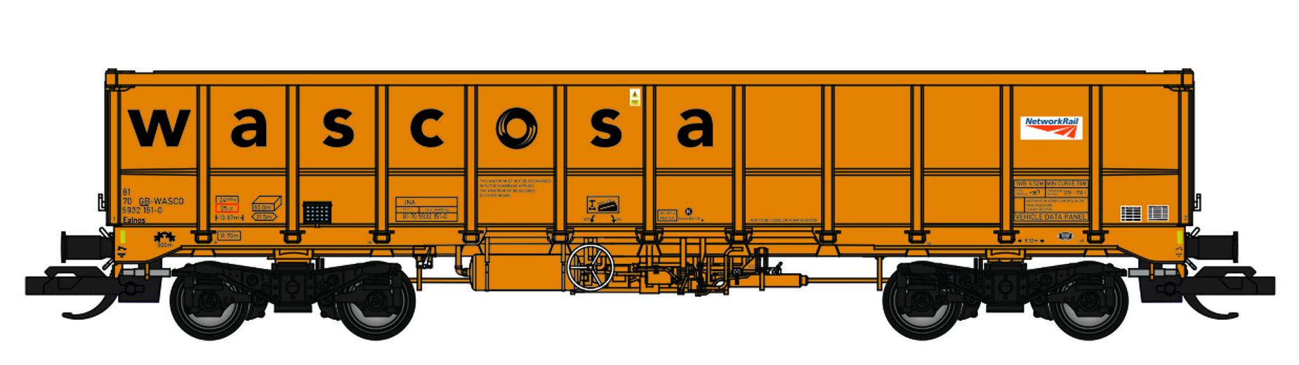| vysokostěnný nákladní vůz oranžový s logem „Wascosa/Network Rail“ |
