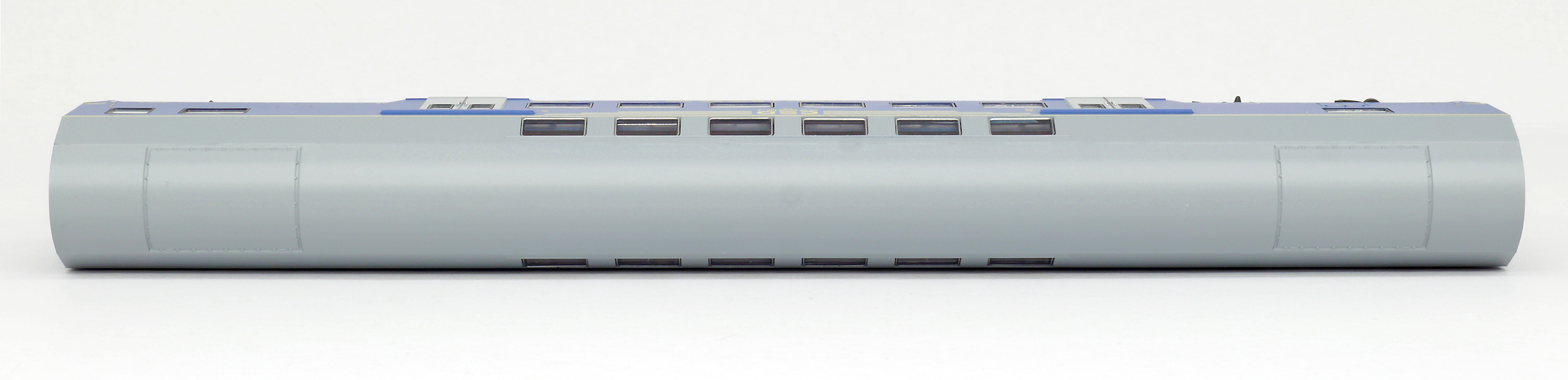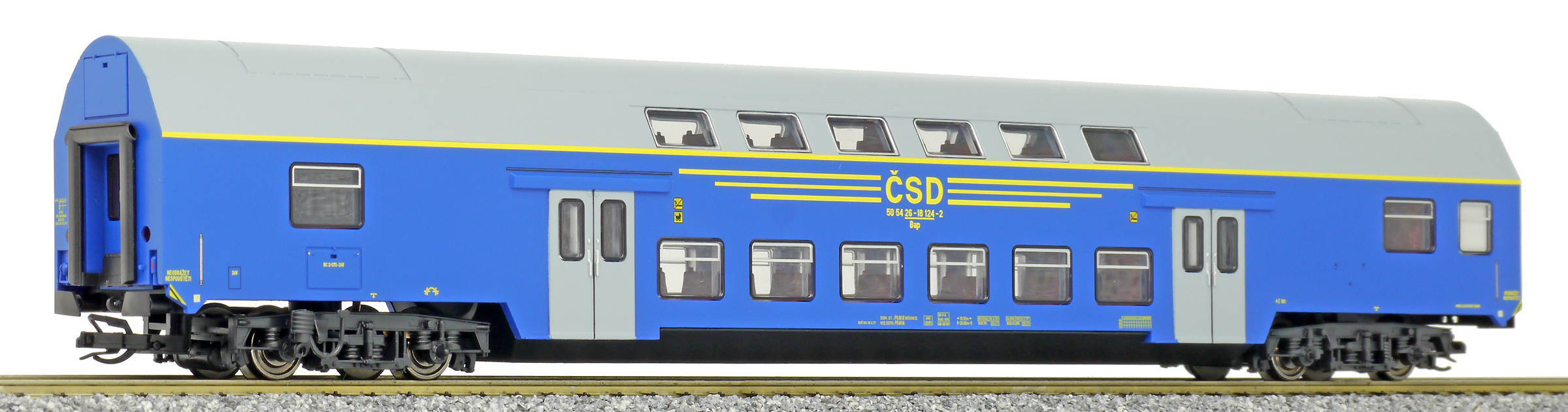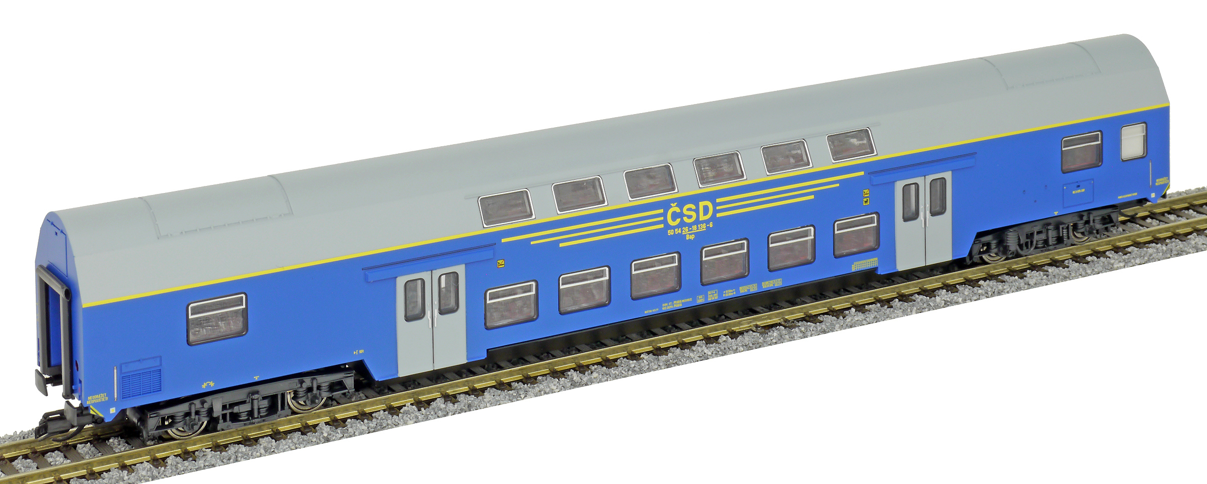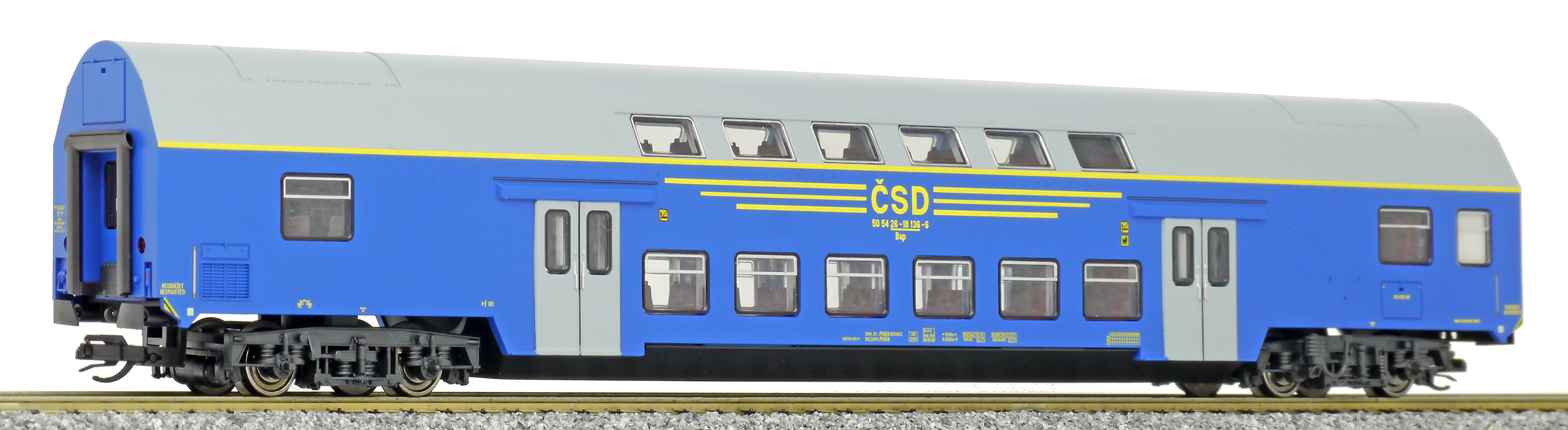 | středový patrový vůz v barvě modré, šedá střecha a dveře |