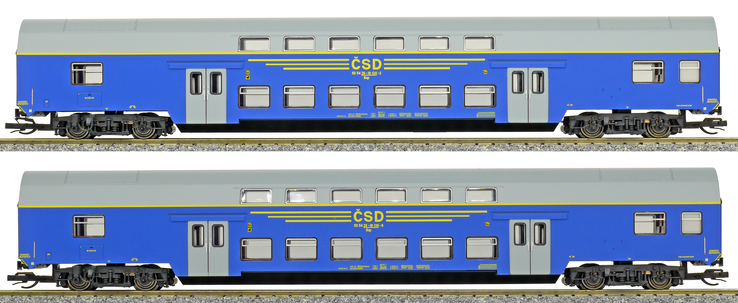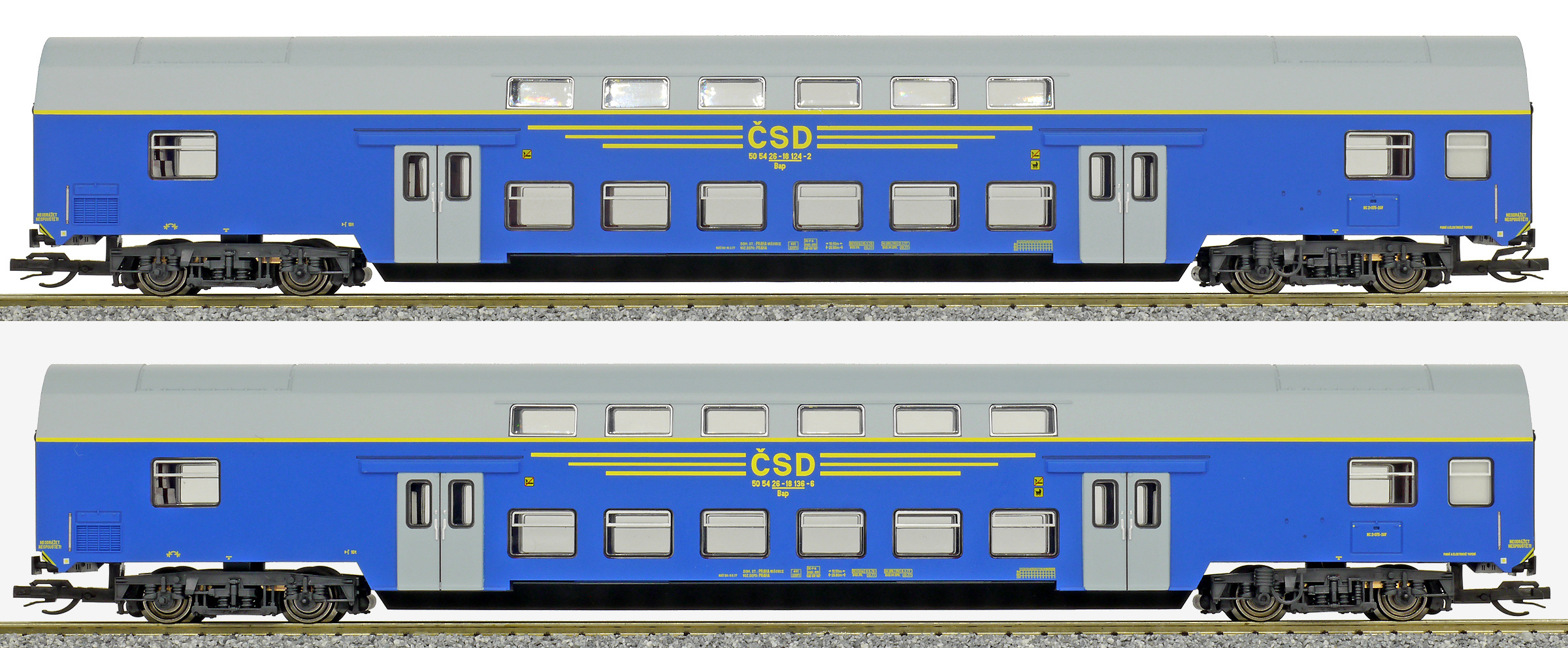 | set dvou patrových vozů v barvě modré, šedá střecha a dveře |