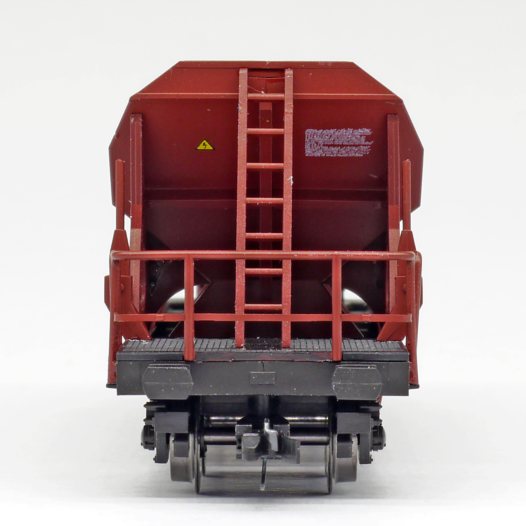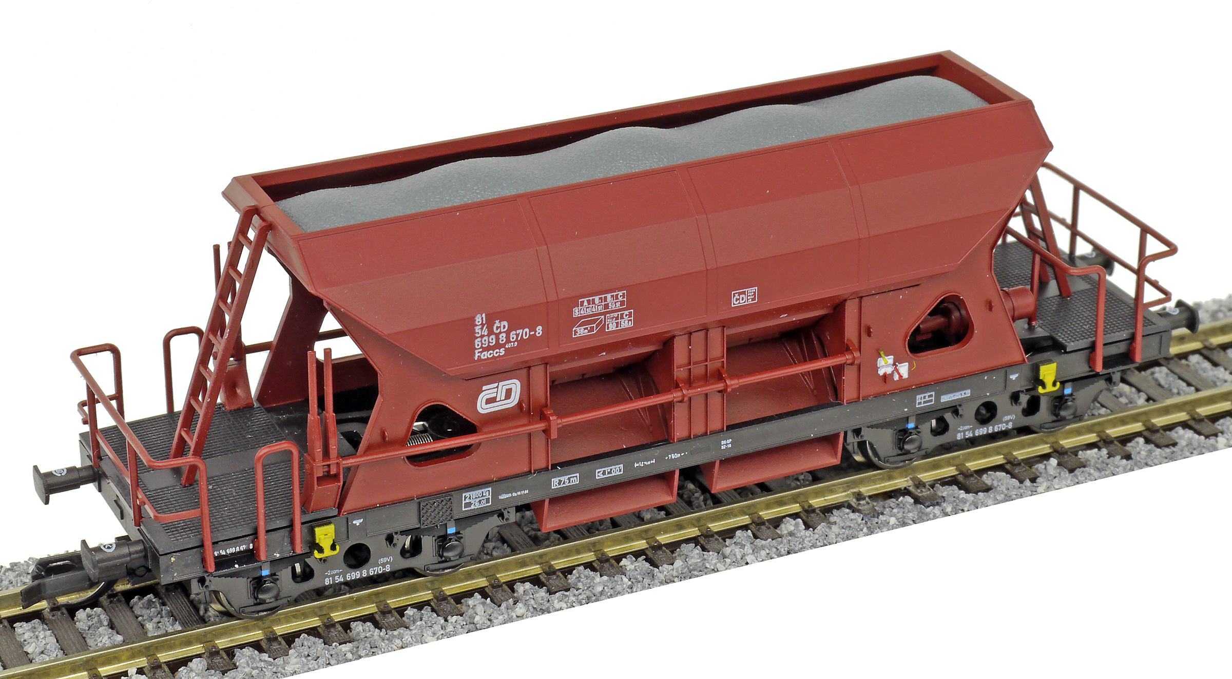 Popis   nákladní samovýsypný vůz červenohnědý s nákladem štěrku
