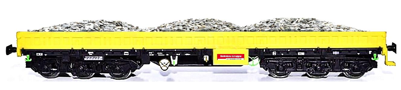 Popis   nízkostěnný nákladní vůz žlutý s černým rámem s nákladem šterku „Bahnbau Gruppe“