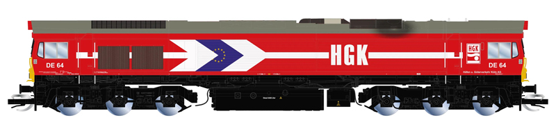 | dieselová lokomotiva červená se žlutými čely, šedá střecha, černý rám a pojezd |