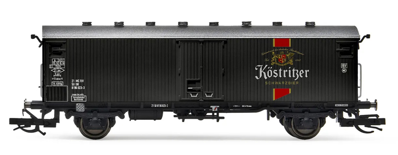 | chladící krytý nákladní vůz černý se stříbřitou střechou „Köstritzer Bier“ |