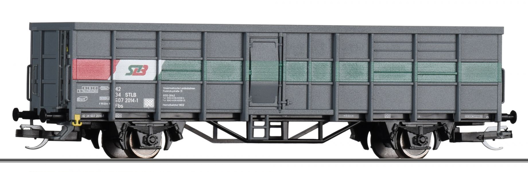| vysokostěnný nákladní vůz šedý s logem „STLB“ |