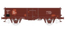 | otevřený nákladní vůz červenohnědý s opravami laku ložený šrotem |