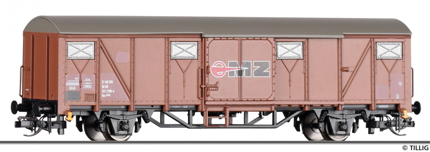 | krytý nákladní vůz červenohnědý s hnědou střechou a s opravnými fleky „MZ“ |