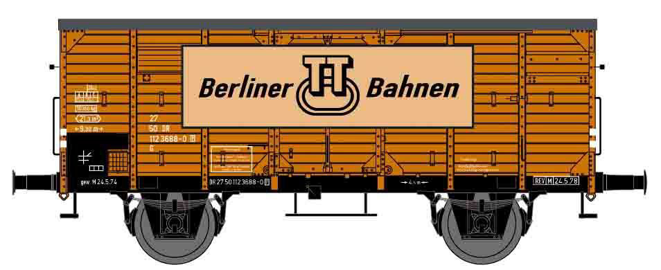 | krytý nákladní vůz hnědý s šedou střechou s reklamou „Berliner-TT-Bahnen“ |