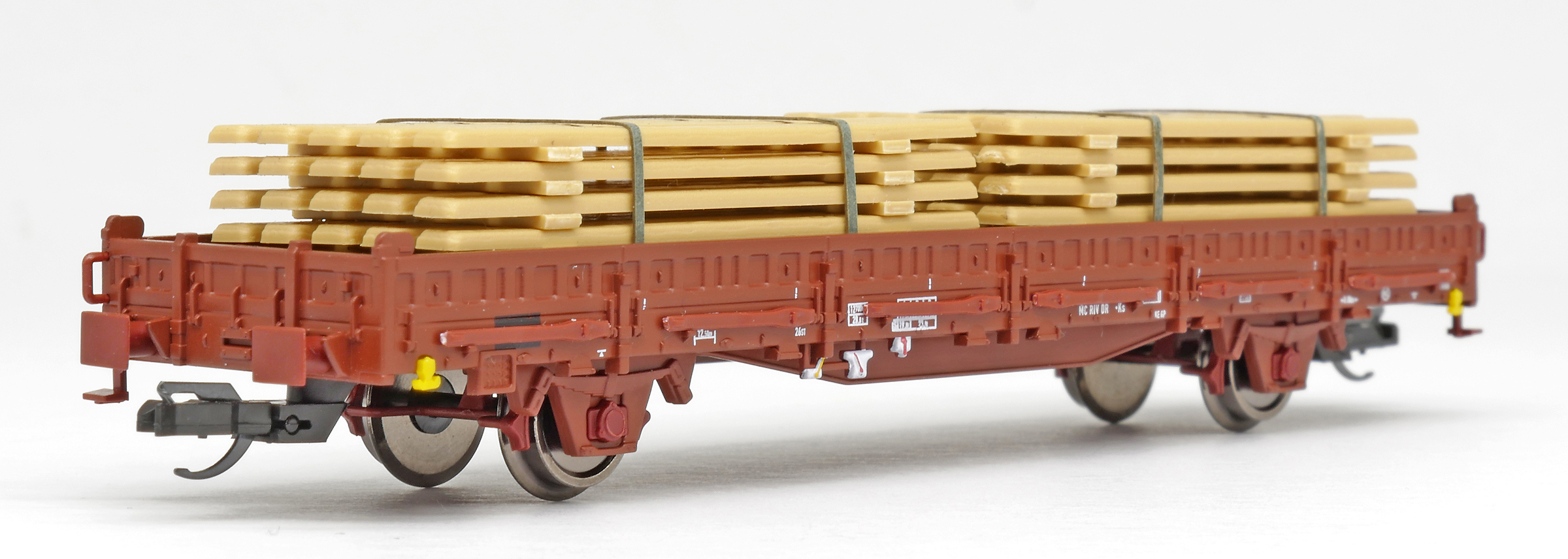 | nízkostěnný nákladní vůz červenohnědý s klanicemi s nákladem stohů desek |