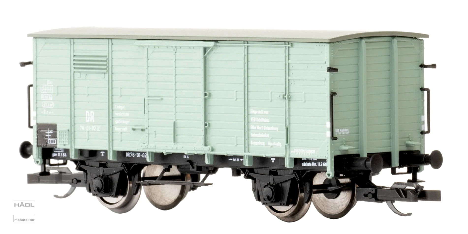 | krytý nákladní vůz světle tyrkysový s šedou střechou pro přepravu kyslíku „VEB Elbe Werft Boizenburg“ |