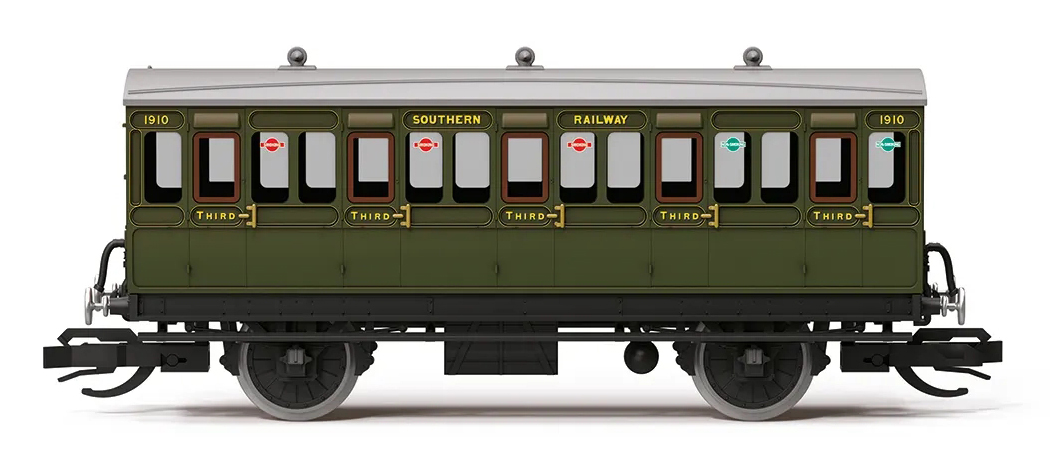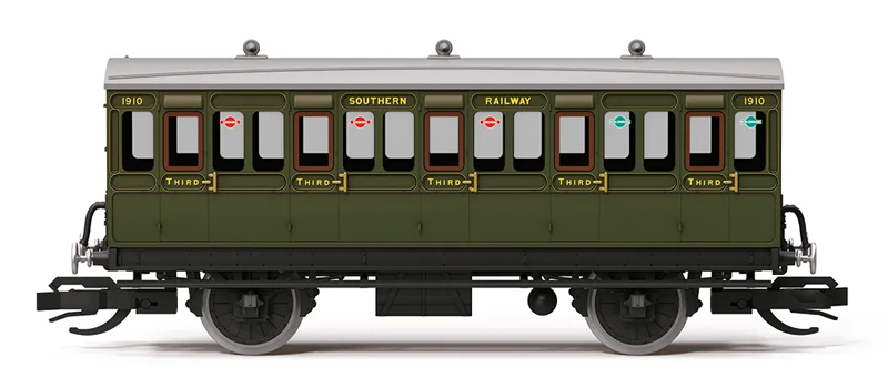 | osobní vůz tmavě zelený se světle šedou střechou „Third Class Coach“ |