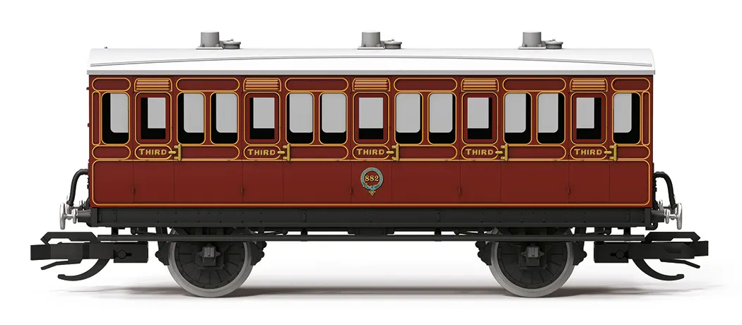 | osobní vůz tmavě červený se světle šedou střechou „Third Class Coach“ |