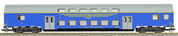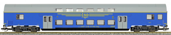 | středový patrový vůz v barvě modré, šedá střecha a dveře |