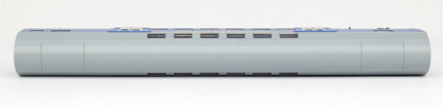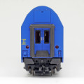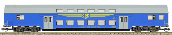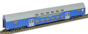 | středový patrový vůz v barvě modré, šedá střecha a dveře |