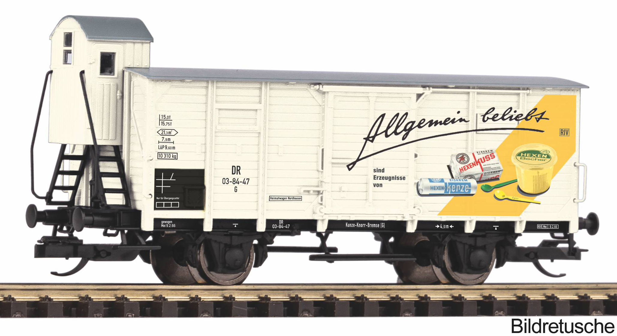 | krytý nákladní vůz bílý s šedou střechou a s brzdařskou budkou „Hexenkuss“ |