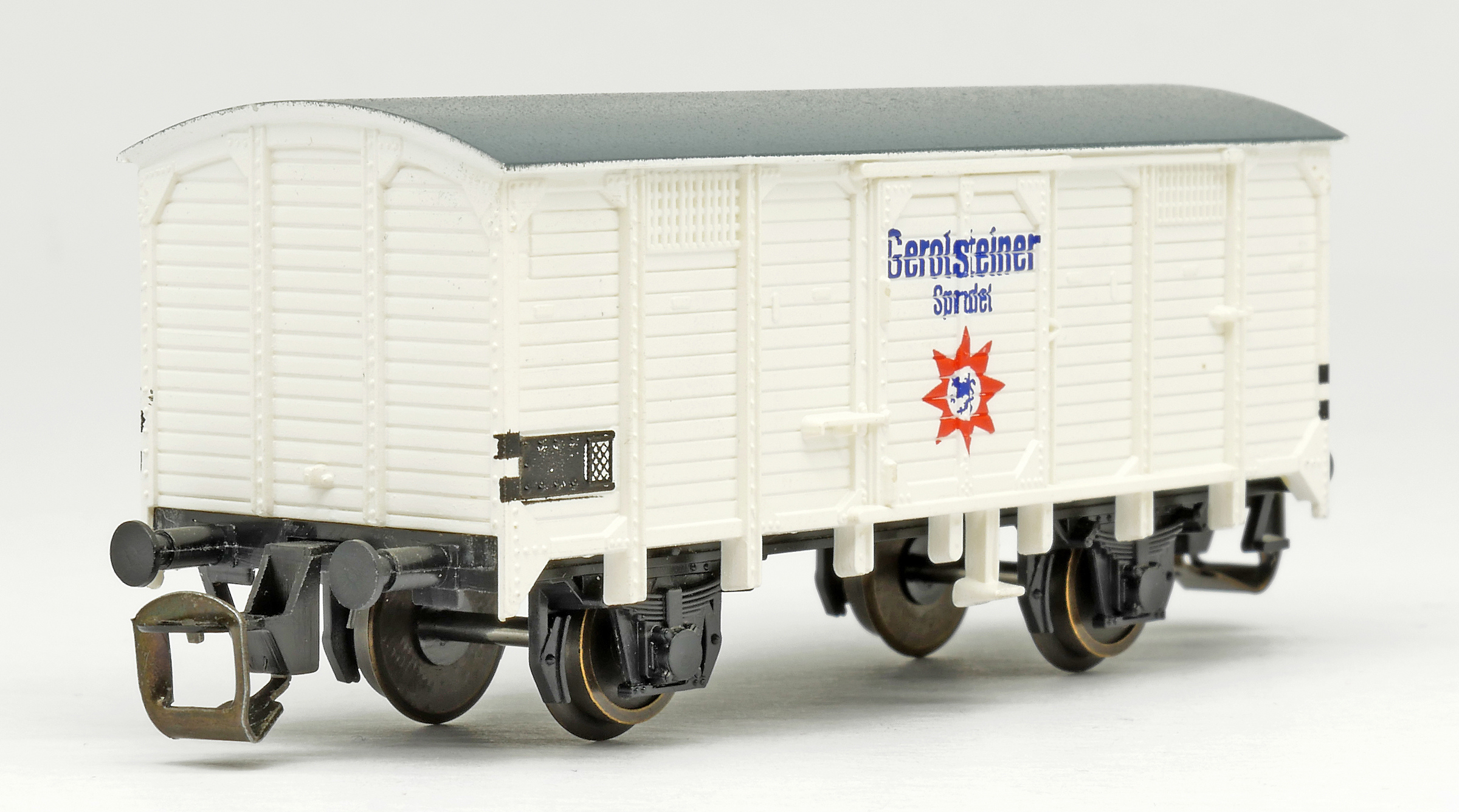 krytý nákladní vůz bílý s šedou střechou „Gerolsteiner“
