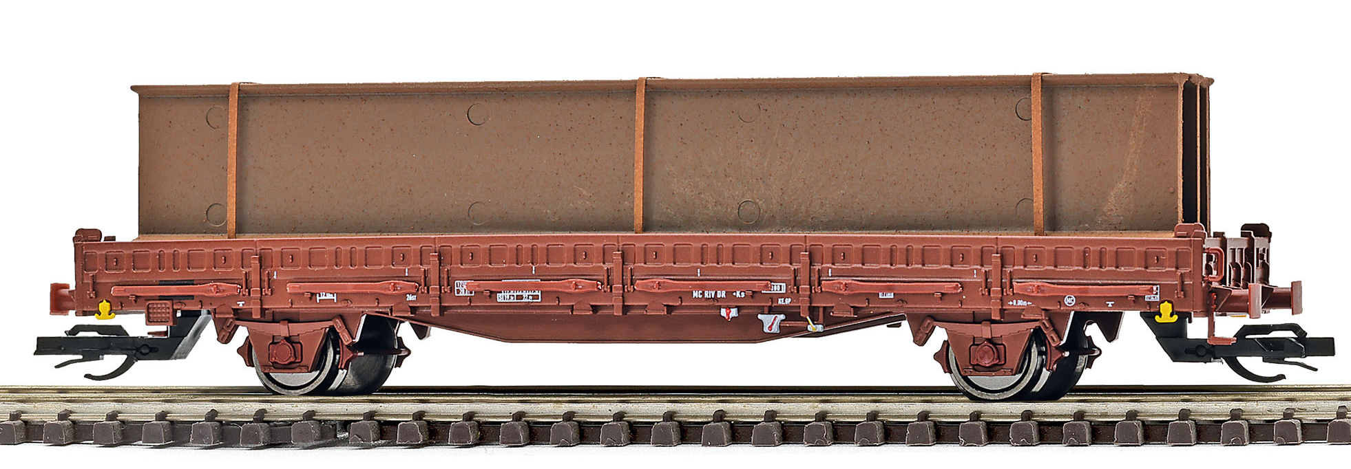 | nízkostěnný nákladní vůz červenohnědý s klanicemi s nákladem ocelových nosníků |
