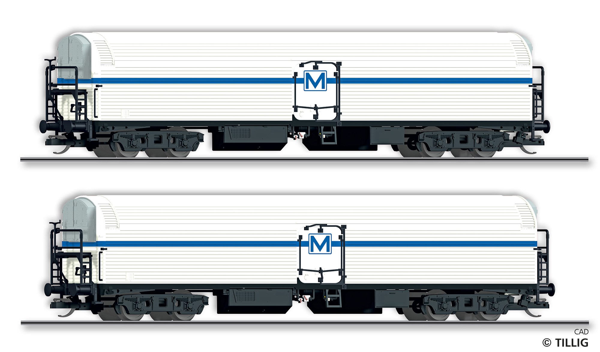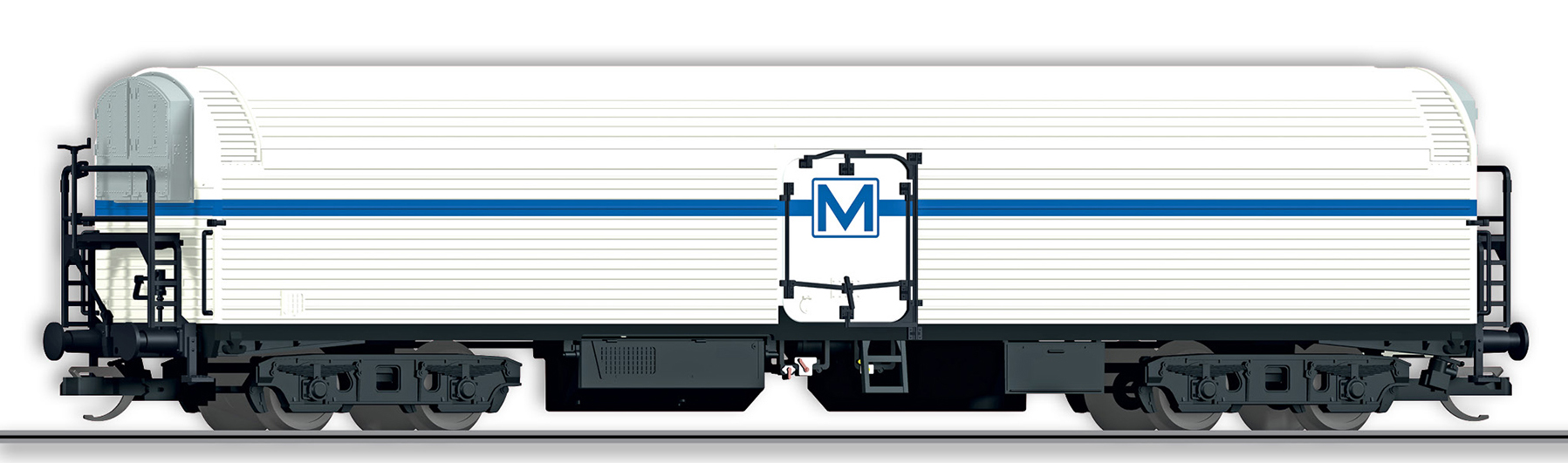 | nákladní chladící vůz bílý s modrým proužkem a logem „M“ |
