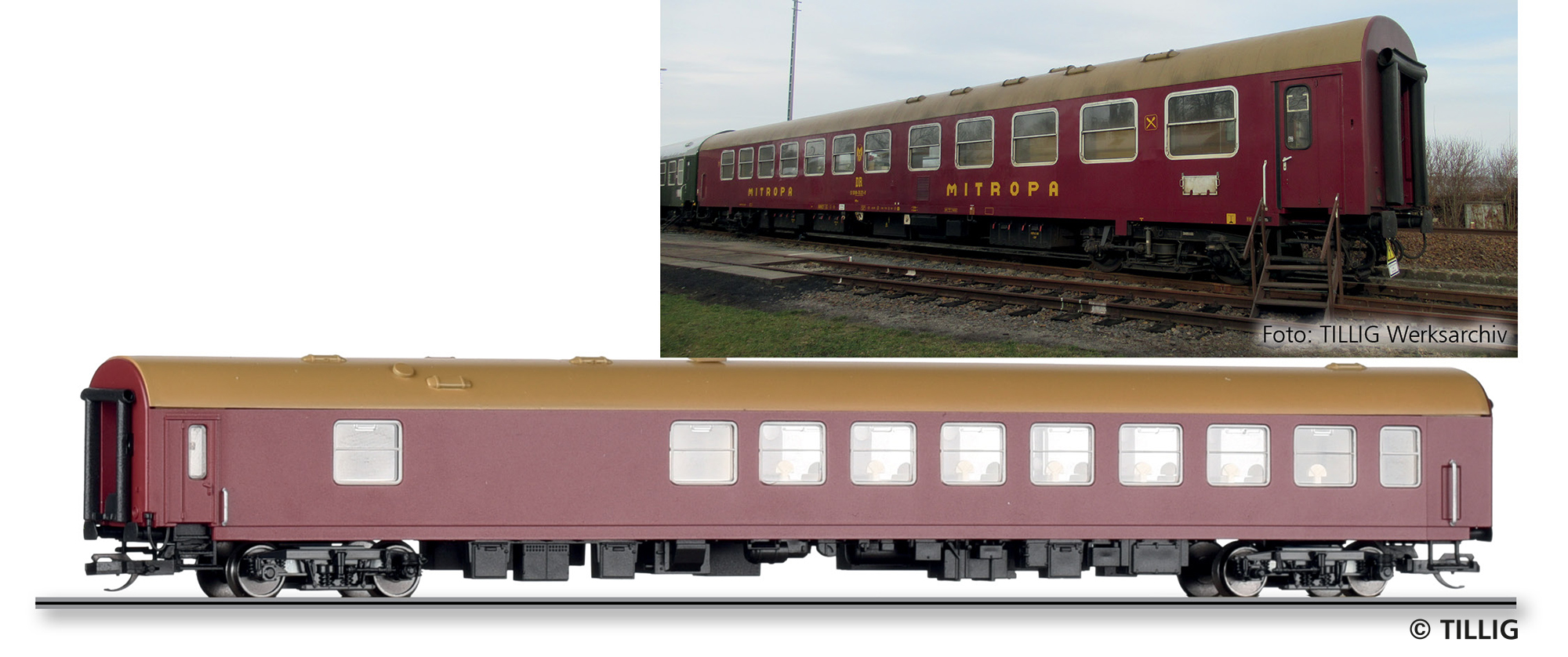 | jídelní vůz červený s šedou střechou „MITROPA“ |