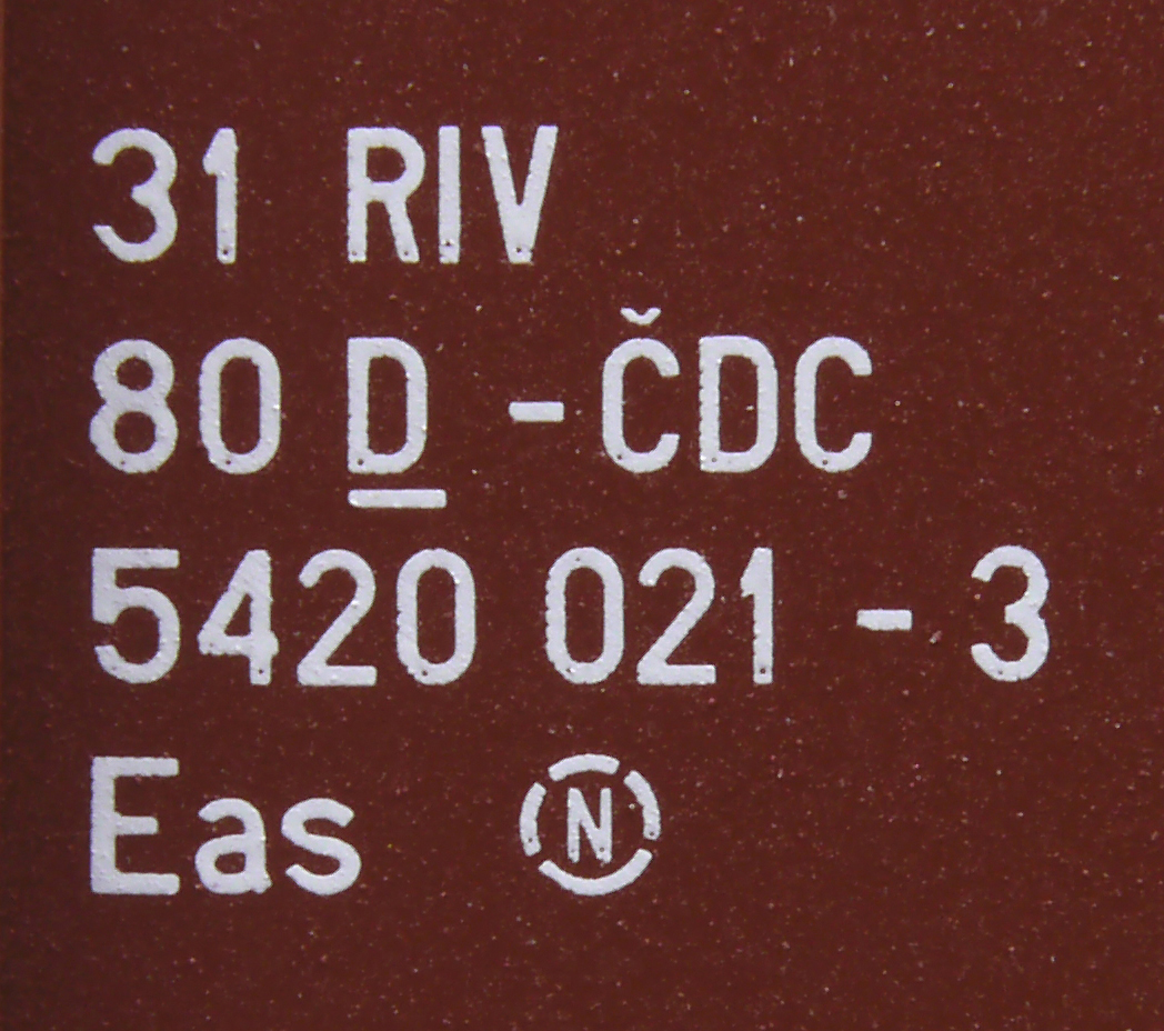 | • 31 80 5420 021-3 | → | nákladní, s podvozky, pevný rozchod, ve vlastnictví železniční správy, RIV, PPV |