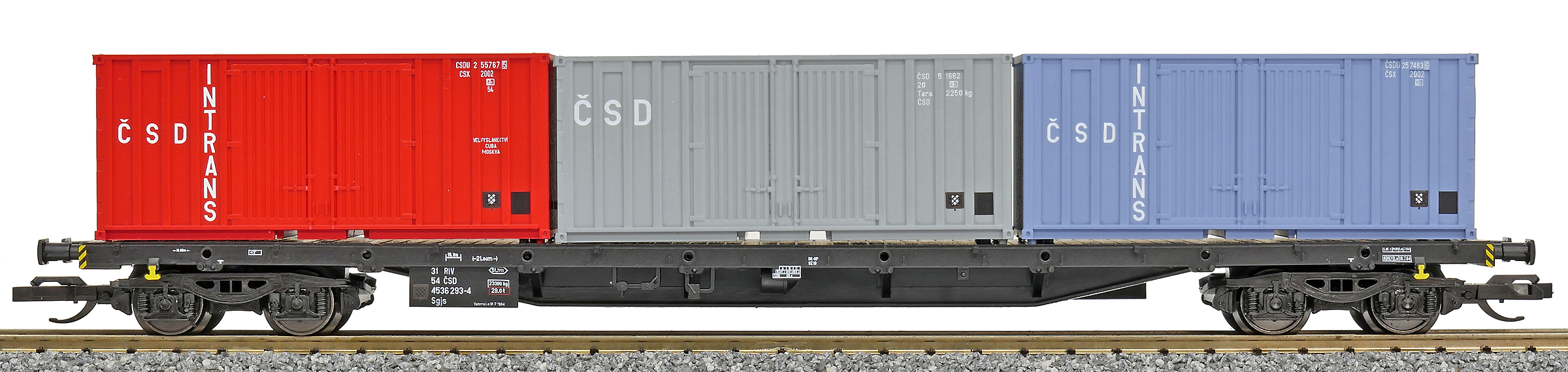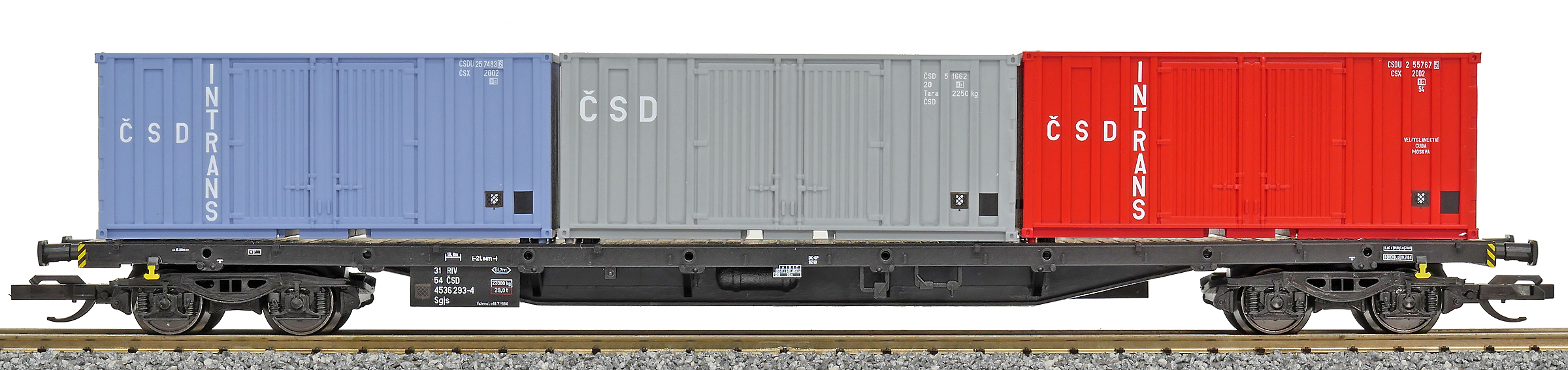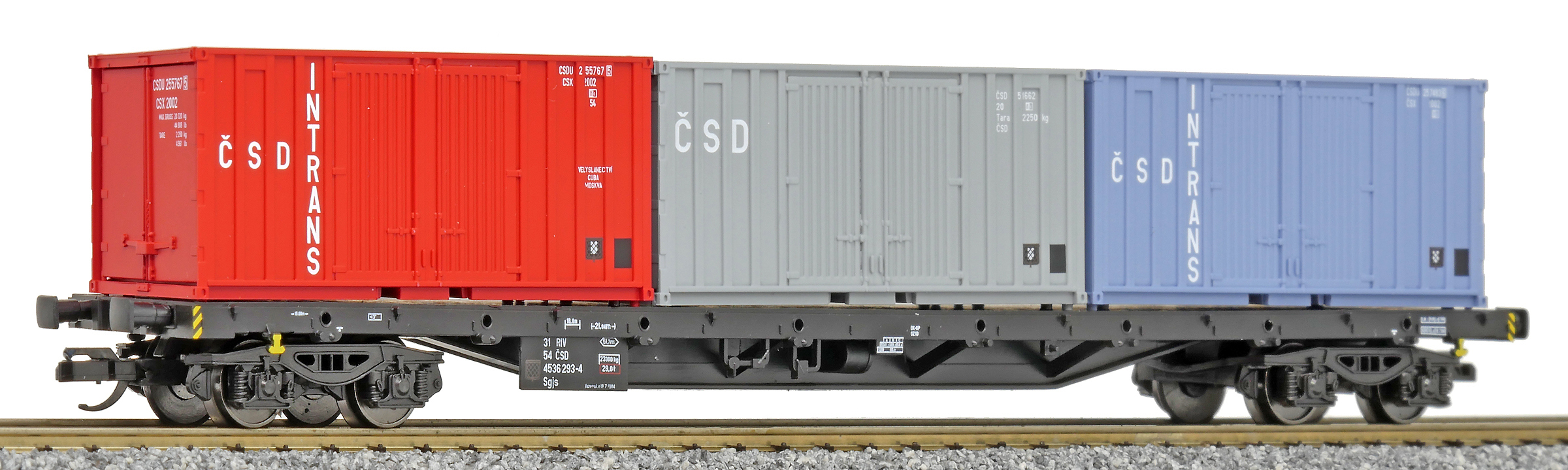 | nákladní plošinový vůz černý se třemi kontejnery 20' „ČSD INTRANS“ |