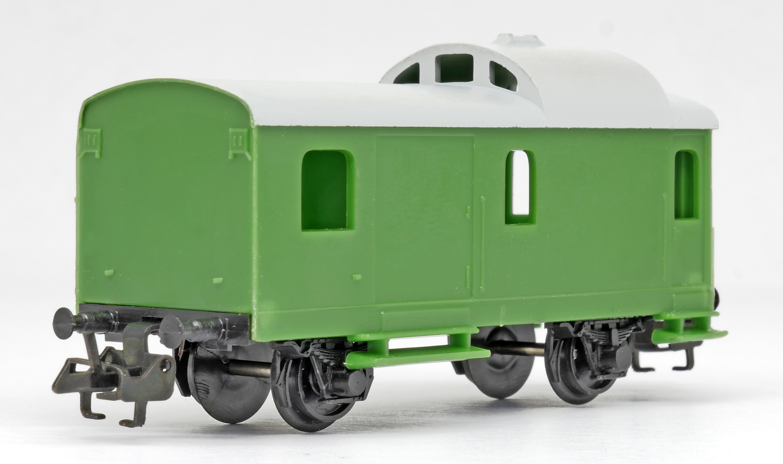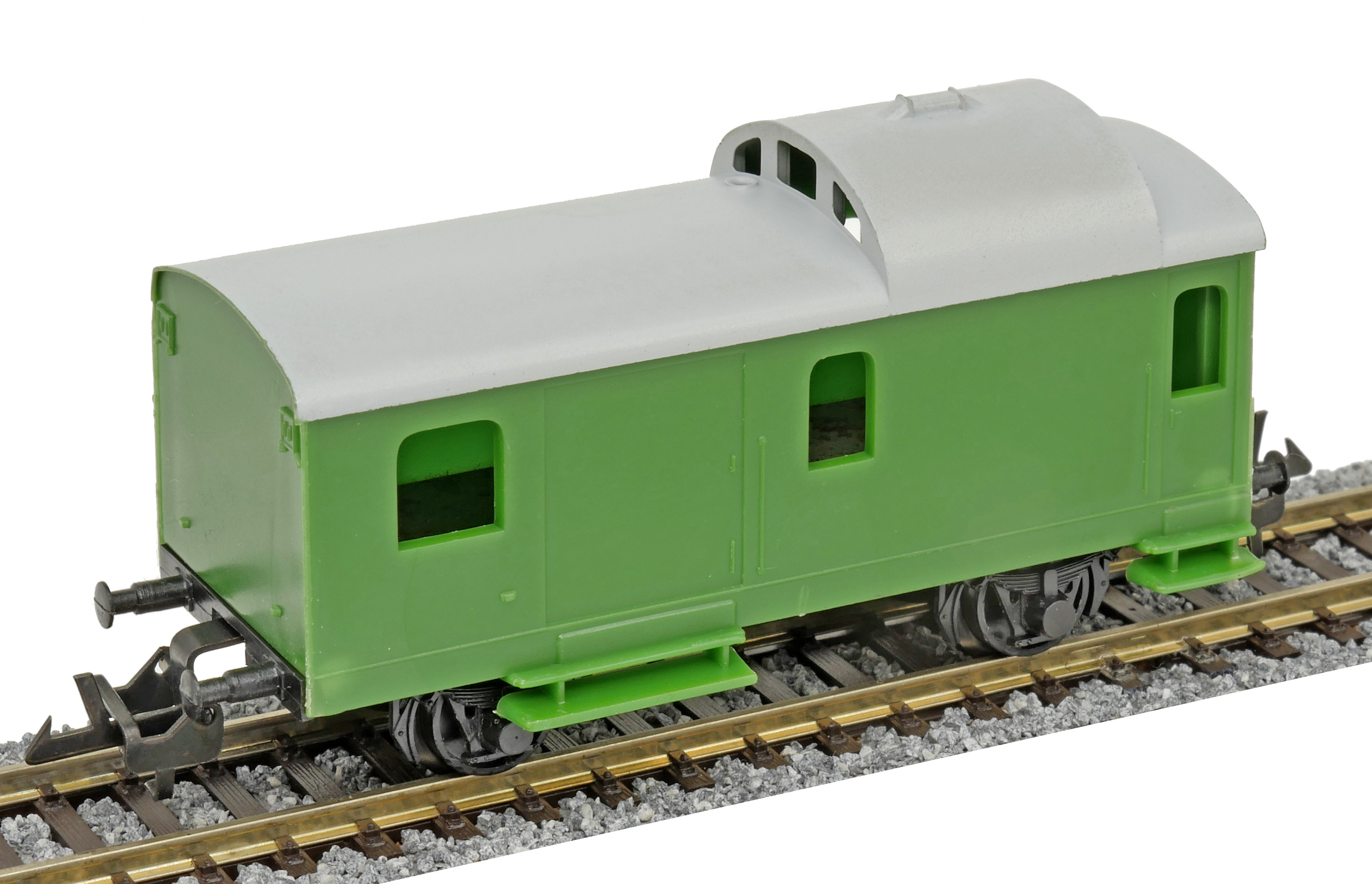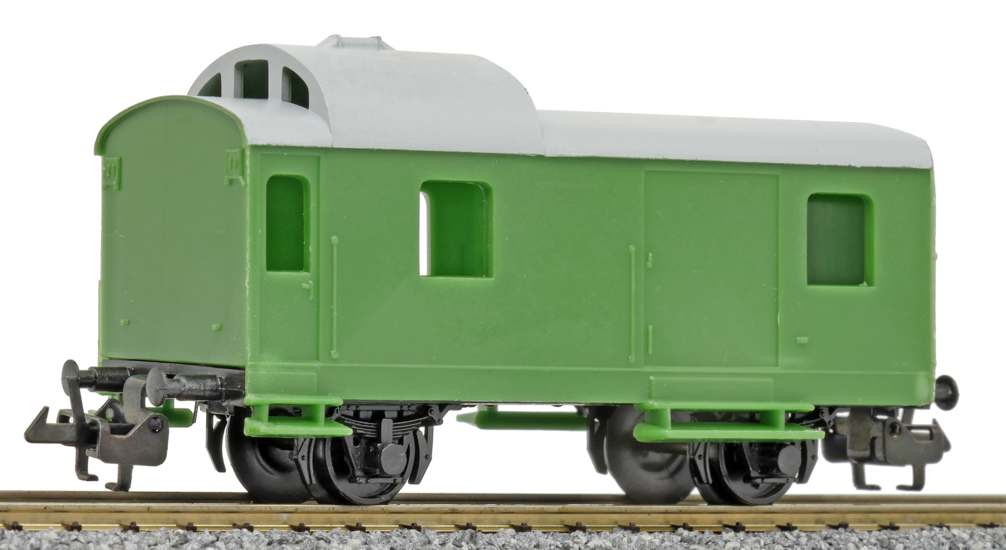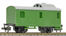 | služební vůz pro nákladní vlaky zelený v barvě plastu s šedou střechou |