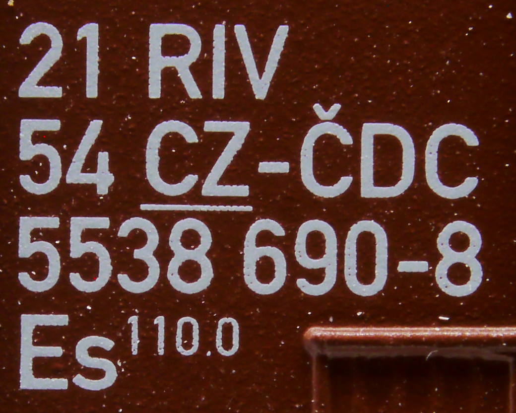 | • 21 54 5538 690-8 | → | nákladní, nezávislé nápravy, pevný rozchod, ve vlastnictví železniční správy, RIV, PPV |