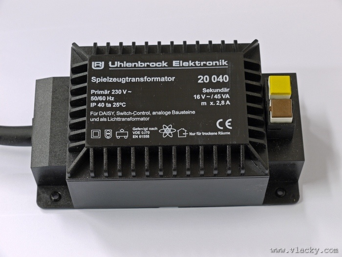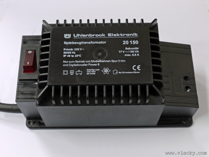 Uhlenbrock Intellibox nebo Power3. Transformátor má svorky se dvěma napětími - 12V a 15V a
