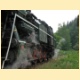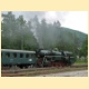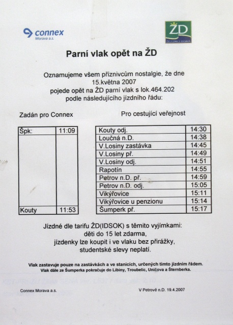 Cestou měl parní vlak plánované jen provozní zastavení v Petrově nad Desnou a Velkých Losinách. Bylo proto obtížné jej cestou odchytit. Počkali jsme si na něj na rovince před Petrovem nad Desnou. I přes neustálé stoupání trati měla lokomotiva pěkně našlápnuto a do Petrova dojížděl vlak výběhem. Díky zdržení u trati se nám podařilo vlak zachytit až při stoupání z Velkých Losin směrem k Loučné nad Desnou. Vlak zde projíždí Velké Losiny zastávku a trať se velkým pravotočivým obloukem přibližuje k silnici. Jedinečné místo na trati, kdy si lze souběžnou jízdou s vlakem vychutnat symfonii parního stroje. Po průjezdu zastávky Loučná nad Desnou-Filipová se dále trať klikatí v Loučné nad Desnou a přejíždí tři přejezdy s místní silnicí. My jsme však pokračovali po hlavní cestě a na vlak jsem si počkali u vjezdu do stanice Kouty na Desnou. Tady končila první, neveřejná část jízdy tohoto mimořádného parního vlaku. Protože je tato stanička celkem krátká, musela být celá souprava popotažena dále na konec, aby uvolnila dopravní kolej, na kterou v 12.16 přijel pravidelný Os 13764 ze Šumperka. Ten se po krátké pauze v 12.40 vracel zpět do Šumperka jako Os 13767. Následným posunem soupravy byly uvolněny obě zhlaví a parní lokomotiva mohla objet soupravu vlaku. Celá souprava byla potom posunuta dále dozadu a dopravní kolej uvolněna pro běžné Os, neboť zpáteční cesta parního vlaku byla plánována až na 14.30. Mezitím přišla intenzivní přeháňka, tak jsem se všichni, kteří kolem vlaku ještě pobíhali, sešli v místním nádražním bufetu. Po nedávné rekonstrukci staniční budovy jsou její prostory na patřičné úrovni. Kdo se v tuto dobu díval na veřejnou webovou kameru, která zachycuje kolejiště v Koutech nad Desnou, tomu nemohl uniknout netradiční ruch a zaplněné staniční koleje. Počasí se umoudřilo a kromě fotografování pózující parní lokomotivy probíhalo mezitím její zbrojení vodou. Náročné stoupání do Koutů nad Desnou znamenalo větší spotřebu vody a bylo proto nutné doplnit její zásobu z cisterny hned dvakrát. Na zpáteční cestě se v Šumperku z časových důvodů nepočítalo s dalším zbrojením a se svou energií, uhlím a vodou, musela parní lokomotiva vystačit až do Olomouce. Z Koutů nad Desnou parní vlak odjížděl jako veřejný Os 72237 v 14.30. Podle vyvěšeného jízdního řádu neměl zastavovat na některých menších zastávkách, ale patrně stavěl na všech. Díky tomu jsme měli více příležitostí zastihnout vlak na trati. Vlastní příjezd do Šumperka v 15.17 byl doprovázen nanápadným deštíkem, který se však během několika následujících minut změnil ve vytrvalý déšť. Tím bylo definitivně rozhodnuto o ukončení naší cesty. Do Olomouce přes Uničov a Šternberk odjel parní vlak místo původně plánovaného času 15.30 tak kolem 15.45, opět jako veřejný vlak, ale stavějící jen ve vybraných stanicích. Tímto děkuji přírodě, že nám posečkala s deštěm až do odpoledne, mému otci za spolupráci cestou a zaměstnavateli, že mě na tuto mimořádnou akci uvolnil. Další informační zdroje: