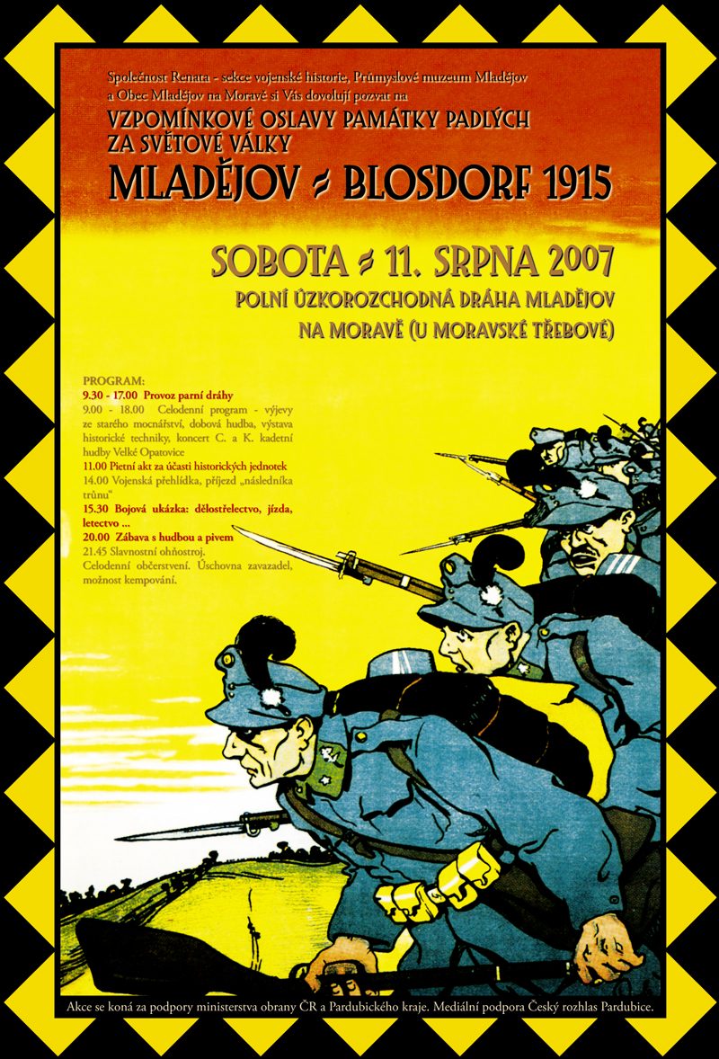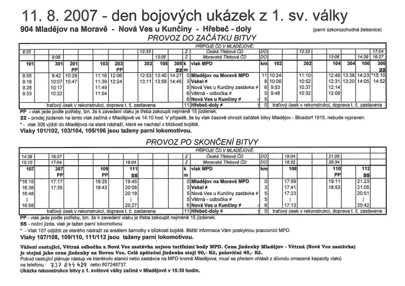 Do mladějovského areálu jsme dorazili kolem půl desáté. V tento den platí mimořádný jízdní řád, protože jízdy bylo nutné zkoordinovat s přípravou a uskutečněním rekonstrukce bitvy. Patrně z toho důvodu nejezdily vlaky až na konečnou Nová Ves u Kunčiny, ale jen do zastávky Veksl nebo Větrná - odbočka. Snahou organizátorů bylo zkrátit oběh souprav vlaků. Po našem příjezdu byl parní vlak 101 s odjezdem v 8:55 již na trati a k odjezdu se chystal motorový vlak 301 s odjezdem v 9:42. Po jeho odjezdu jsem se šli podívat na tábory obou vojsk a jak vypadá bojiště před odpolední bitvou. Tam jsem zachytil návrat parního vlaku 102 s příjezdem do Mladějova v 10:24 a za chvíli byl na trati vlak 201 s odjezdem v 10:29, které jel jen do zastávky Veksl. Vrátili jsme se zpět do areálu na nové nádraží a chtěli jsme se svézt dalším parním vlakem 103 s odjezdem v 11:16, ale ouha. Jízdenky na tento vlak již byly vyprodány. No co se dalo dělat, rozhodli jsem se počkat na motorový vlak 203 s odjezdem ve 12:03 a ve zbylém čase jsme posvačili při kávě. Odjeli jsme motorovým vlakem 203 z Mladějova ve 12:03 do zastávky Veksl. Tam nás čekala na vykřižování souprava parního vlaku 104 na zpáteční cestě, na jejíž konec byla přivěšena i naše souprava. Motorovou lokomotivu jsme zanechali na místě a obě spojené soupravy se vrátily do Mladějova ve 12:49. Po odjezdu dalšího motorového vlaku 303 ve 12:53 jsem vyrazil na nejbližší kopec, abych zachytil jízdy vlaků nad Mladějovem. Do začátku bitvy zbývaly ještě tak 2 hodiny a počasí se začalo zhoršovat. Obloha začala šednout a ve směru od Moravské Třebové se blížila bouřka. Návrat motorového vlaku 306 v 15:10 byl již za vydatné přeháňky. Vlak při návratu do Mladějova zajel na staré nádraží, kde už probíhaly přípravy před bitvou. Přesně v 15:30 vyráží vojenský transport na trať, ukázka bitvy může začít. Než parní vlak dosupěl s vojskem na pozice, přestalo i pršet. Bitva trvala přibližně 45 minut a vývoj na bojišti byl chvílemi nepřehledný. Ruským vojskům se podařilo hned v úvodu zmocnit transportu, ovšem daleko nedojeli. Vojska v záloze zablokovala trať a transport se musel vrátit zpět na bojiště, kde se bitva posléze přenesla do zákopů. Za pomoci dělostřelecké podpory na jedné straně a obrněného vozidla na druhé straně se podařilo oběma vojskům získávat malé územní výhody. Bitva skončila závěrečným útokem na zákopy bojem muže proti muži na bodáky. Odpolední program po vítězné bitvě pokračoval dalšími jízdami. Parní vlak 107 s výletníky vyrazil na trať ze starého nádraží až v 17:15 a po chvíli za ním mimořádný motorový vlak - vojenský transport (snad jako vlak 307). Zážitků jsme měli za celý den dostatek a jako ostatní návštěvníci, také jsme pomalu vyrazili na zpáteční cestu. Další informační zdroje: