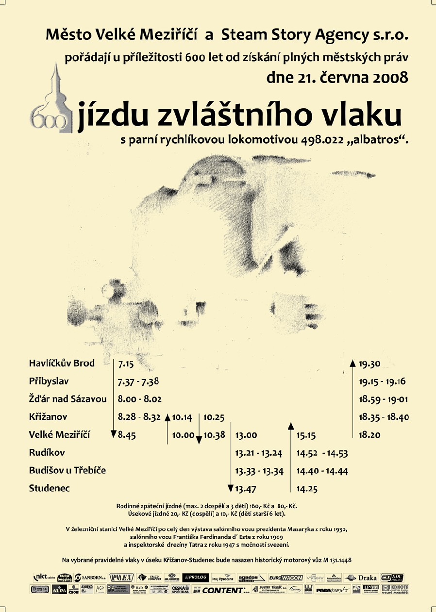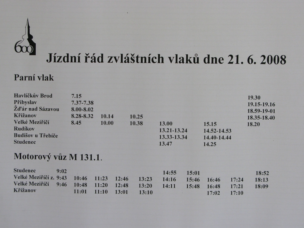 Využil jsem příležitosti, že jsem toho víkendu pobýval nedaleko a do Velkého Meziříčí jsem měl cestu gumokolem jen přes kopec. Cestou jsem se zastavil nejdříve ve stanici Křižanov, kam parní vlak přijel načas podle jízdního řádu v 8.28. Parní lokomotiva přijela "uhlím dopředu", takže bylo hned jasné, jak budou další jízdy v okolí Velkého Meziříčí vypadat. Po odjezdu parního vlaku jsem se vypravil k nedaleké zastávce Martinice u Velkého Meziříčí, abych si našel vhodné místo před další jízdou parního vlaku. Během dopoledne měl parní vlak vykonat ještě jednu jízdu do Křižanova a zpět bez dalších zastavování. Krátce po 10. hod. se zastávka zaplnila místními obyvateli a všichni jsme očekávali průjezd parního vlaku. Už zdálky bylo slyšet, že parní lokomotiva má pěkně našlápnuto do stoupání a zastávku projela s vlakem tak rychle, že se mnozí a ni nestačili rozkoukat a vlak byl pryč. V Křižanově pouze parní lokomotiva objela soupravu a za chvíli se vlak vracel zpět do Velkého Meziříčí. Pokračoval jsem dále do stanice Velké Meziříčí. Parní lokomotiva byla v obležení. Zároveň probíhala údržba lokomotivy, kontrola a mazání pojezdu. Ve stanici byly u skladištní rampy přistaveny k nahlédnutí salónní vozy Františka Ferdinanda d'Este z roku 1910 a prezidenta Masaryka z roku 1930. Bohužel bylo do nich možno nahlédnout jen otevřenými okny. Dále po manipulační koleji pojížděla inspektorská drezína Tatra DM-4 z roku 1947 a na vybraných spojích jezdil motorový vůz M131.1448 "Hurvínek". Sluníčko se mezitím schovalo za mraky a zamířil jsem proto ke stánku pro občerstvení. Přesto mi neušlo, že plně obsazena drezína Tatra odjela ve 12.23 na několik minut mimo stanici na trať. Parní vlak se chystal na další jízdu a místa ve vlaku se rychle plnila. Vzdal jsem variantu, že bych se parním vlakem svezl do Studence a zpět. Po odjezdu parního vlaku v 13.00 jsem si prohlédl drezínu a zkusil jsem se zeptat, co že to bylo za jízdu mimo stanici. Díky ochotě personálu mi bylo také umožněno svézt se drezínou až na ocelový most za stanicí a pořídit z této vyjížďky zajímavý záznam. Byla to zároveň poslední jízda drezíny toho dne, po našem návratu z trati posunoval drezína na druhou stranu stanice na manipulační kolej, odkud byla nakládána zpět na přívěsný vozík. Čas polední pauzy rychle utekl a v 15.15 se vrátil parní vlak ze své cesty do Studence. Parní lokomotiva potom posunovala nejdříve na doplnění uhlí a na stejné koleji potom dozbrojení vodou ze dvou hasičských cisteren. Sama si potom posunovala ve stanici aby připravila vlak na zpáteční cestu se správným řazením vozů. Jídelní vůz přišel hned za lokomotivu a oba salónní vozy opět na konec vlaku. To však nebylo vše. Za stanicí jsem očekával příjezd pravidelného Os24955 v 17.21 v podání M131.1448 a za chvíli po jeho příjezdu pomalu posunovala na most samotná parní lokomotiva 498.022 pro potěchu oka všech přítomných. Na odjezd parního vlaku v 18.20 jsem si opět počkal u mostu a sledoval jsem vlak, než velkým obloukem po mostě překoná údolí a zmizí v zářezu na protilehlém kopci. Stanice Velké Meziříčí se vylidnila a já se také vydal na zpáteční cestu. Další informační zdroje: