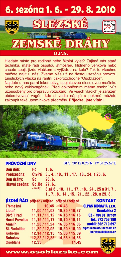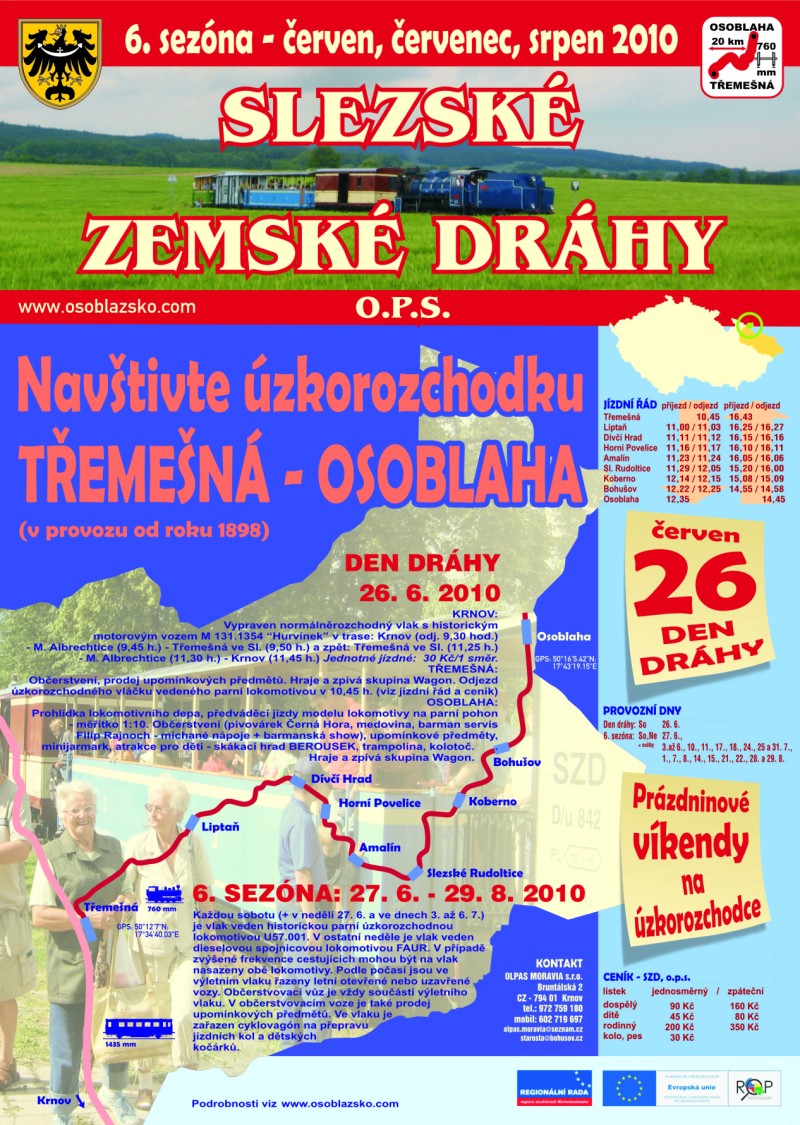 Změny se dotkly také běžného provozu na trati. V dopravně Horní Povelice byla zrušena nejkratší manipulační kolej na úzkorozchodné trati, na kterou se mezi výkolejky vešel stěží jeden nákladní vůz. Nákladní provoz na trati je sice minulostí, ale tato manipulační kolej byla takovou místní raritou. V červenci se vrátila z dílen JHMD v Kamenici nad Lipou zmodernizovaná lokomotiva 705 913-2. Lokomotiva je remotorizována s elektronickým řízením. Jízdní řád trati 298 Třemešná ve Slezsku - Osoblaha je sestaven tak, že pro zajištění provozu postačí na oběhu souprav jedna motorová lokomotiva. Ostatní jsou jako zálohy v depu v Osoblaze. Předposlední srpnový víkend se počasí skutečně vydařilo. Na cestu do Třemešné jsem si přivstal. Vyplatí se být na místě dříve, protože parní lokomotiva U57.001 bývá zatopena již brzy ráno a zpravidla tak po 9. hodině začíná první posunování a sestavení soupravy. Tentokrát byla souprava z kapacitních důvodů doplněna o dva úzkorozchodné Btu. Důvodem byla rezervace míst ve výletních vozech pro dva zájezdy. Přiblížila se 10. hodina. Byl čas vyrazit k trati. Měl jsem namířeno nejdříve do Slezských Rudoltic. Tam jsem očekával příjezd pravidelného Os 20606 s rekonstruovanou lokomotivou 705 913-2. Co naplat, osobní doprava slábne a pohled na jedoucí vlak na této trati bude stále vzácnější. Vracím se zpět k Třemešné. Od lesíka nad Třemešnou je dobrý rozhled na celou Třemešnou, na úzkorozchodnou trať 298 a na protilehlém svahu na normálněrozchodnou trať 292 z Třemešné směrem k Jindřichovu ve Slezsku. Nejdříve projíždí kolem pravidelný Os 20606 a dvěma oblouky mizí v Třemešné. Zanedlouho přijíždí do Třemešné rychlík R883. Na tento spoj parní vlak čeká. Polohu nádraží lze určit podle stoupajícího kouře. Parní vlak Os 20651 konečně vyjel na trať. Hned v prvním úseku k přejezdu se silnicí č. 57 musí lokomotiva zdolat soupání 30 promile. Pokračuji dále na horizont mezi Amalínem a Slezskými Rudolticemi. Pole jsou sklizena a výbornou viditelnost tak kazí jen tetelení horkého vzduchu. Parní vlak Os 20651 projíždí kolem a v klesání sjíždí do Slezských Rudoltic. Tam je plánována větší provozní přestávka z důvodu předjetí pravidelným spojem Os 20607, který je již na trati. Kvůli tomuto vlaku se vracím do Horních Povelic. Dále vynechávám zastavení ve Slezkých Rudolticích a pokračuji až do Bohušova. S drobným zpožděním zde zastavuje pravidelný Os 20607 a za další zhruba čtvrthodinku vyjíždí z lesa očekávaný parní vlak. V Osoblaze se nádraží postupně vyprazdňuje. Parní lokomotiva nejdříve posunuje soupravu vlaku na manipulační kolej a potom sama posunuje k depu, kde je v polední pauze dozbrojena vodou. Konečně nastal klid na odpočinek, který přeruší až v 13:50 odjezd pravidelného Os 20608. Na nádraží se začínají pomalu scházet první výletníci a parní lokomotiva opět posunuje po stanici a přesunuje soupravu vlaku na dopravní kolej. Na odjezd parního vlaku Os 20650 v 14:45 však nečekám a odjíždím do Bohušova. Při zpáteční jízdě vyhlížím parní vlak nejdříve před Bohušovem. Díky dobrému počasí je kouř parní lokomotivy vidět až od Osoblahy. Dále pokračuji do Slezských Rudoltic. Parní vlak Os 20650 přijíždí v 15:20 a zastavuje před první výhybkou. Jakmile jsou výhybky přestaveny, zajíždí parní vlak přímo na manipulační kolej, protože zde bude křižovat s protijedoucím Os 20609 v 15:52. Než odjíždějící pravidelný Os 20609 zmizí v lese, je parní vlak Os 20650 připravený k odjezdu na dopravní koleji. Před příjezdem do stanice Liptaň zdolává parní vlak další stoupání. Pár minut postačuje, abych přeběhl do stanice zachytit odjezd parního vlaku. Ten má před sebou poslední úsek do Třemešné ve Slezsku. Poslední desítky metrů před stanicí musí parní lokomotiva zabrat do náročného stoupání. Na výletníky čeká v Třemešné ve Slezsku připravený přípoj Os 3583 do Krnova. Na úzkých kolejích ruch neutichá. Motorová lokomotiva TU38.001 ještě pomáhá rozposunovat vozy na svá místa. Další informační zdroje: