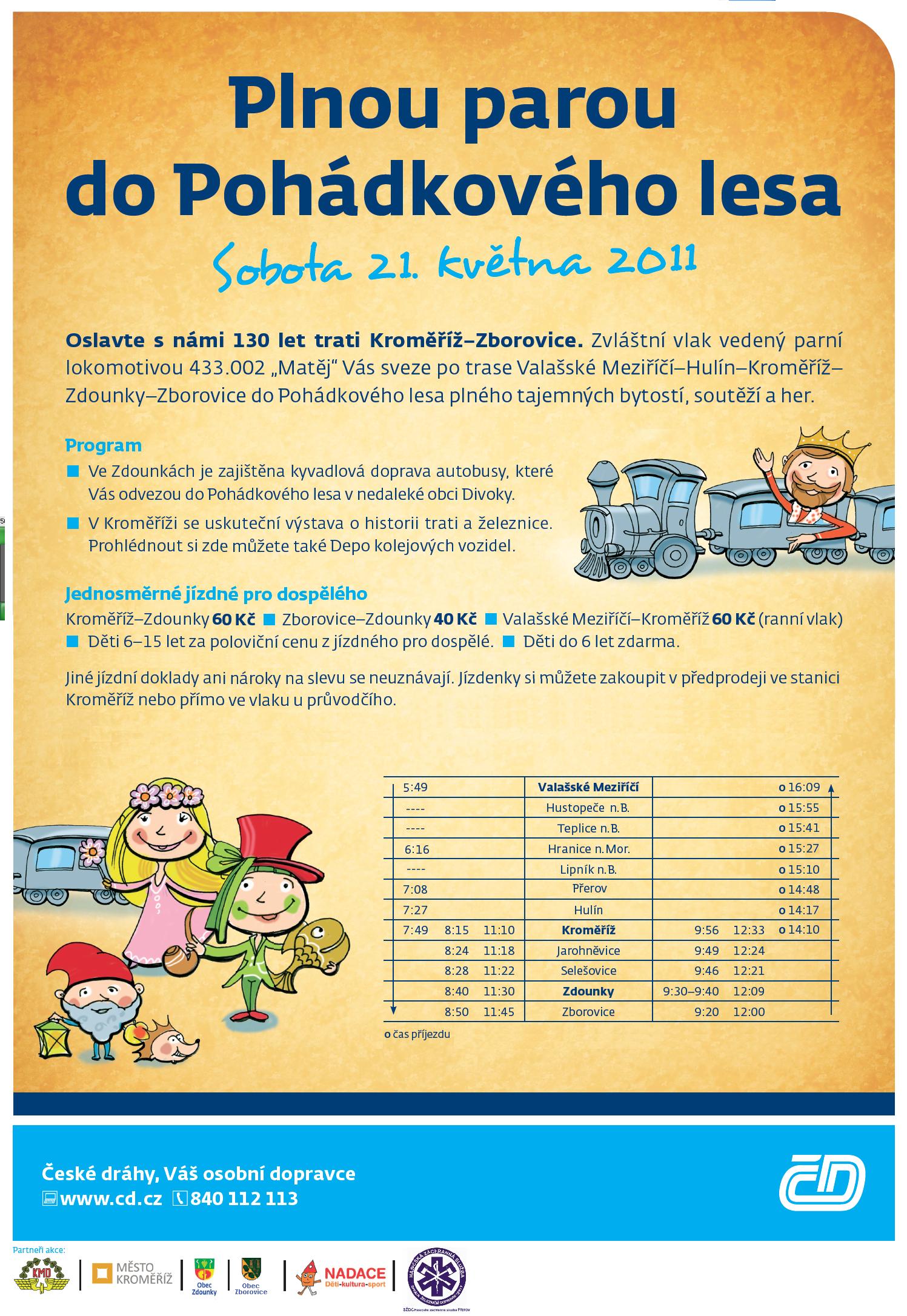Plnou parou do Pohádkového lesa   Letošní jízdy parního vlaku v rámci akce Pohádkový les Divoky spojené s oslavami 130 let trati Kroměříž - Zborovice se v mnohém lišily od jízd uskutečněných v minulém roce. Podstatné bylo, že se letos počasí umoudřilo a kromě jízd parních vlaků se podle programu uskutečnila také akce Pohádkový les v Divokách nedaleko obce Zdounky. Dále kvůli výluce na trati 303 Kojetín - Valašské Meziříčí byl parní vlak z Valašského Meziříčí trasován přes Hranice na Moravě a Přerov. A nakonec i příznivce parní lokomotivy 433.002 „Matěj” potěšilo, že na parním vlaku byly nasazeny dobové „dřeváky” a všechny jízdy parního vlaku byly bez postrku.