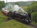 Jakmile po 8. hodině déšť trochu polevil, rozhodl jsem se přece jen vyrazit k trati směrem k Bystřici nad Pernštejnem. Prvním očekáváným vlakem byl pravidelný Sp 1778 PERNŠTEJN ve stoupání před Bystřicí nad Pernštejnem. Původně jsem myslel, že v takovém počasí budu u trati asi osamocen, ale zanedlouho se i tady objevily známé tváře, které ani takové počasí neodradilo od svého koníčka. Hned první záběr z průjezdu Sp 1778 ukázal, že za deště a tak špatné viditelnosti bude těžké pořídit trochu koukatelné video. Po průjezdu Os 14909 jsem osušil techniku a přesunul jsem se blíže k Rožné, kde jsem vyčkal průjezdu Os 14906 vedeného T478.1010. Dále jsem čekal schován pod deštníkem na příjezd prvního parního vlaku Sp 1823 z Havlíčkova Brodu s parní lokomotivou 475.101, která v Havlíčkově Brodu po včerejší jízdě z Brna nocovala a dnes se na zvláštním parním vlaku Sp 1823/1825 vracela zpět do Brna. Bohužel začalo opět vytrvale pršet a váhal jsem, jestli nedělní program raději neukončit. Ve stanici Rožná jsem potkal opět několik známých tváří, prohodil pár slov a potěšen pozdravem jednoho z kolegů „přeji suché světlo” jsem přece jen vyrazil k trati mezi Rožnou a Jabloňovem. Souprava parního vlaku Sp 1822, který jel z Brna do Nedvědice, pokračovala do Rožné a zpět jako Os 14980/14981. Tentokrát v čele vlaku stanuly parní lokomotivy 475.111 a 475.179. V Rožné vlak setrval zhruba hodinu a po vykřižování s pravidelným Os 14911 a Os 14908 se v 12:30 vracel zpět do Nedvědice. První parní lokomotiva 475.111 po včerejší jízdě nocovala v Brně a vracela se zpět a druhá parní lokomotiva 475.179, která zůstala v Brně kvůli problémům při jízdách z minulého týdne, byla na tomto vlaku zařazena mimořádně a také se vracela domů do Děčína. Vrátil jsem se zpět na základnu do Nedvědice, abych se převlékl do suchého a kolem 14. hodiny jsem zamířil na stanici, abych zachytil křižování pravidelných Os 14912 z Tišnova a Os 14913 ze Žďáru nad Sázavou. Ve stanici Nedvědice jsem potom pozoroval provozní údržbu a zbrojení parních lokomotiv, kterým se bez ohledu na počasí věnovaly jejich čety, aby je připravily před další odpolední jízdou. Bohužel se kolem 15. hodiny spustil tak intezivní déšť, že jsem musel utéci domů a převléci se opět do suchého. Dění ve stanici jsem mohl pozorovat z okna a jakmile jsem po 16. hodině slyšel parní lokomotivu 475.101 posunovat na tišnovském zhlaví a také trochu ustával déšť, spěchal jsem opět na stanici. To se již připravoval Sp 1825 k odjezdu do Brna v 16:28. Po jeho odjezdu posunovala druhá souprava Sp 1824 na druhém zhlaví na dopravní kolej. Zbývalo ještě počkat na křižování s vracejícím se Sp 1779 PERNŠTEJN v 16:53 a potom již v 17:04 při odjezdu parního vlaku Sp 1824 obě parní lokomotivy 475.111 a 475.179 zahalily stanici Nedvědice do oblaků páry a sazí. Program Slavností se chýlil ke svému konci. Bohužel počasí poznamenalo celkovou návštěvnost jak samotného programu Slavností u rybníka nebo na hradu Pernštejn, tak i obsazenost zvláštních parních vlaků. Další dokumentační záběry ze stanice Nedvědice jsem ještě pořídil v 18:03 při odjezdu Os 14921 a při obratu soupravy Os 14954/14955 v 19:03. Úplně posledním záběrem pak bylo křižování Os 14925 a Os 14956 v 20:04 ve stanici Nedvědice. Další informační zdroje:
