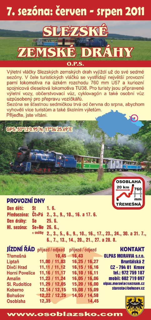 Jízdní řád zvláštních vlaků zůstal stejný, jako v uplynulých letech. Odjezd z Třemešné ve Slezsku v 10:45 a odpolední návrat zpět v 16:43. Sobotní vlaky budou vedeny parní lokomotivou U57.001 a nedělní potom motorovou lokomotivou TU38.001 „Faur”. Do Třemešné jsem se snažil přijet co nejdříve, abych měl dostatek času zachytit přípravu obou parních lokomotiv. Do odjezdu parního vlaku v 10:45 zbývalo ještě dost času, ale stanice se začala brzy plnit návštěvníky. Souprava parního vlaku byla mezitím sestavena a čekala vzadu u výtopny na příjezd pravidelného Os20606 z Osoblahy. Před desátou hodinou jsem přejel do Slezských Rudoltic, abych vyčkal příjezdu pravidelného Os20606. Po jeho odjezdu v 10:08 jsem se vracel zpět přes Horní Povelice a Liptaň do Třemešné. Obloha se mezitím zatáhla a spustil se déšť. Ten vytrval až do příjezdu pravidelného Os20606 v 10:36 z Osoblahy a R1183 v 10:40 z Jeseníku. Déšť stále nepolevoval a vytrvale doprovázel i odjezd parního vlaku Os20651 v 10:45. Vrátil jsem se do stanice, kde byl zvláštní motorový vlak připravený k odjezdu zpět do Krnova v 11:00. Pokračoval jsem dále směrem do Horních Povelic. Zdá se, že déšť je zapomenut a na obloze se ukazuje opět slunce. Pravidelný Os20607 má trochu zpoždění. Parní vlak Os20651 už čeká ve Slezských Rudolticích na předjetí. Je vhodné připomenout, že do roku 2008 byla v Horních Povelicích blíže k budově ještě manipulační kolej, na kterou se mezi výkolejky vešel jeden nákladní vůz. Patrně to byla vůbec nejkratší manipulační kolej v naší železniční síti. Další zastavení mám naplánováno v Bohušově. Nejdříve přijíždí pravidelný Os20607 a za necelých 20 minut také parní vlak Os20651. Do Osoblahy přijíždím v okamžiku, kdy už probíhá posunování s prázdnou soupravou vlaku. Netrvá dlouho a déšť se nás snaží zahnat na nástupiště pod střechu. Až s odjezdem pravidelného Os20608 v 13:50 se počasí trochu umoudří. Po 14. hodině parní lokomotivy U57.001 a U46.002 vyjíždí od depa a posunují se soupravou vlaku zpět na dopravní kolej. Ještě před odjezdem parního vlaku Os20650 v 14:45 přejíždím do Bohušova, abych zachytil příjezd parního vlaku. S časovou rezervou přejíždím dále do Slezských Rudoltic a jdu až do polí před stanici. Z lesa vyjíždí parní vlak a zdolává poslední protisměrné oblouky ve stoupání před stanicí Slezské Rudoltice. Ve stanici parní lokomotivy dobírají vodu a vlak vyčkává na křižování s pravidelným Os20609, který je posílen navíc o jeden vůz. Potom parní vlak posunuje na dopravní kolej a v zápětí v 16:00 odjíždí ze stanice Slezské Rudoltice. Posledním místem, kde očekávám parní vlak Os20650, je palouk naproti kostelu v Třemešné s výhledem na celé údolí a úzkorozchodnou trať až za přejezd s hlavní silnicí č. 57. Po zdolání posledního stoupání příjíždí parní vlak Os20650 do Třemešné ve Slezsku v 16:43. Souprava vlaku byla odklizena, parní lokomotiva U46.002 byla dozbrojena vodou, odpopelena a za využití zbylého provozního tlaku sama posunovala na plošinový vůz, na kterém byla odvezena zpět do Krnova. Další informační zdroje:
