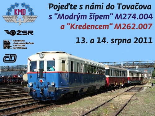 Organizátoři jízd zvláštních vlaků na „Tovačovce” se snaží pro zvýšení atraktivity zajistit vždy jiné soupravy vlaků. Tentokrát na trať zavítala vskutku zahraniční souprava motorových vozů M274.004 „Modrý šíp” a M262.007 „Kredenc” doplněná jedním vloženým vozem Bix. Souprava byla zapůjčena z Múzejno-dokumentačného centra Bratislava (MDC) a zvláště unikátní modro-krémový „Modrý šíp” byl magnetem zvláštních jízd. Jízdy zvláštních vlaků probíhaly po oba víkendové dny. V sobotu bylo na trať vypraveno 8 párů zvláštních vlaků, v neděli o jeden méně. Většinu vlaků odjezdila kompletní souprava, pouze v sobotu poslední dva páry jezdil samostatný „Modrý šíp” a při obrátce posledního vlaku v sobotu měl v Tovačově plánovaný delší půlhodinový pobyt z důvodu nočního focení. Kroměřížské depo poskytovalo po oba dny zázemí pro soupravu, první vlak byl vždy vypravován z Kroměříže a poslední zase do Kroměříže zajížděl. Při jízdě po trati Kojetín - Tovačov zastavovaly vlaky pouze na zastávce Lobodice. Sobotní počasí si s námi po celý den trochu pohrávalo. Měl jsem ten den jiný program a pro návštěvu „Tovačovky” jsem měl vyčleněnu neděli. Ráno jsem byl v Tovačově před příjezdem prvního ranního vlaku v 9:30, ale celé okolí ještě tonulo v mlze. Předpověď počasí na neděli byla optimističtější, ale okolní rybníky a mokřiny udělaly své a příjezd prvního vlaku byl lépe slyšitelný než viditelný. Souprava vlaku jezdila tento den ve složení M274.004 + Bix + M262.007 ve směru do Tovačova, v sobotu bylo složení soupravy obrácené. První dva páry vlaků jsem dokumentoval v Tovačově a Lobodicích a teprve při jízdě třetího páru vlaků v polích za Uhřičicemi konečně vysvitlo slunce. První odpolední jízdu po zhruba hodinové pauze jsem vynechal, protože jsem odjel do Kroměříže a vrátil jsem se zpět až na jízdu pátého páru vlaků. Zbylé nedělní jízdy zvláštních vlaků jsem potom dokumentoval v úseku Tovačov - Oplocany a v Tovačově jsem po odjezdu posledního vlaku Os 31311 v 17:27 svoje putování zakončil. Další informační zdroje: