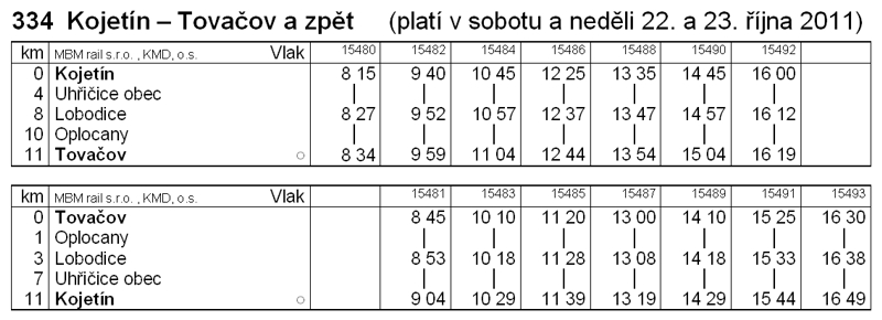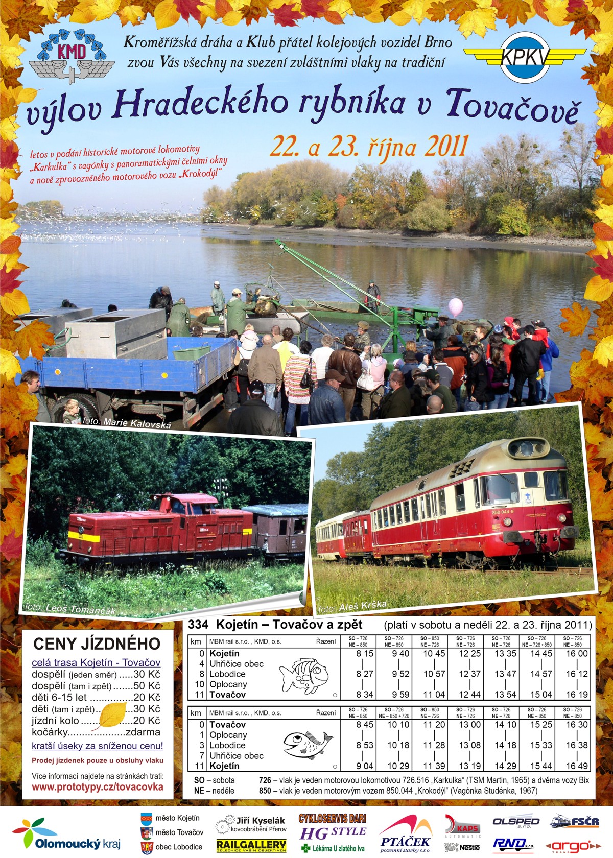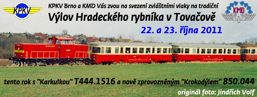 Tovačov a okolí trati 334 Kojetín - Tovačov jsem navštívil jen v sobotu 22. října. Po oba dny ožila lokálková trať provozem zvláštních vlaků. Také se stalo tradicí, že soupravy vlaků jsou na akcích obměňovány a tentokrát se o vozbu zvláštních vlaků podělila lokomotiva T444.1516 „Karkulka” a motorový vůz 850 044-9 „Krokodýl” se soupravou dvou přívěsných vozů Bix. Jízdy zvláštních vlaků na tovačovské trati se dostaly za poslední roky do povědomí a tak přitahují i zájemce o pouhé svezení po trati bez pravidelné osobní dopravy. Sobotní jízdy zvláštních vlaků měly být původně v režii lokomotivy T444.1516 „Karkulka” a pouze pár vlaků Os 15484/15485 měl být vedený motorovým vozem 850 044-9 „Krokodýl”. Později se ukázalo, že kvůli technickým problémům motorové lokomotivy T444.1516 bylo nutné trochu improvizovat a poslední dva páry vlaků ponechat také v režii motorového vozu 850. Předpověď počasí na tento podzimní víkend slibovala skoro jasno, ovšem s přízemními mrazíky brzy po ránu při východu slunce. To vše platilo do příjezdu prvního ranního vlaku Os 15480, na který jsem čekal v Tovačově. Vycházející slunce pěkně osvítilo přijíždějící vlak. Než stihla lokomotiva objet soupravu vlaku, kterou tvořily dva vozy řady Bix, z okolních polí se začala valit hustá mlha. Stačilo pouhých deset minut do odjezdu vlaku Os 15481 v 8:45 z Tovačova a po slunci nebylo ani památky. Počasí tedy opět nepřekvapilo a v této podobě vydrželo téměř do 11. hodiny, kdy začala mlha konečně ustupovat. Tou dobou jsem již očekával za Uhřičicemi vlak Os 15484, který se vynořil u hřbitova z mlhy, aby dále směrem k Lobodicím pokračoval již za krásného slunečného počasí. Polední pauzu jsem využil ke krátké návštěvě náměstí v Tovačově a občerstvení. Následující pár vlaků Os 15486/15487 byl posílen o motorový vůz 850 a v Tovačově tak odpadlo objíždění vlaku lokomotivou. Kvůli již zmíněným technickým problémům na lokomotivě T444.1516 byly poslední dva páry vlaků v sestavě 850 + 2x Bix. Poslední pár vlaků Os 15492/15493 tradičně zaznamenávám na louce před Tovačovem a nejinak tomu bylo i tentokrát. Přestože jsem akci věnoval jen sobotu, krátce bych se zmínil o nedělním průběhu. Drobná závada na palivové soustavě lokomotivy T444.1516 byla odstraněna a bez problémů tak proběhl odvoz vlaku na vlečku Toposu v sobotu ve večerních hodinách. Nedělní jízdy zvláštních vlaků proběhly dle rozpisu. Opět nepřekvapilo počasí a v neděli znovu přispělo ranními mlhami, které rovnou přešly do zatažené oblohy. V letošním roce byly tyto víkendové jízdy poslední na tovačovské trati. Další informační zdroje: