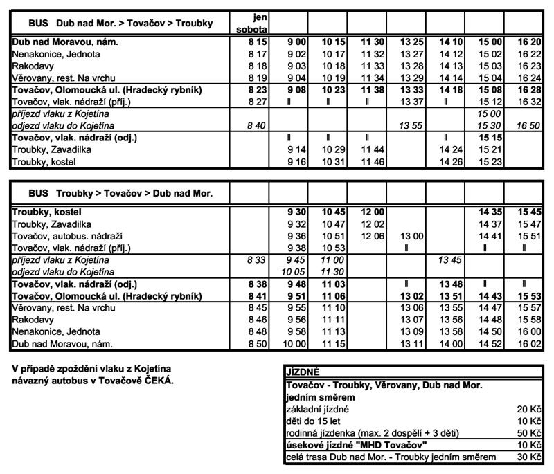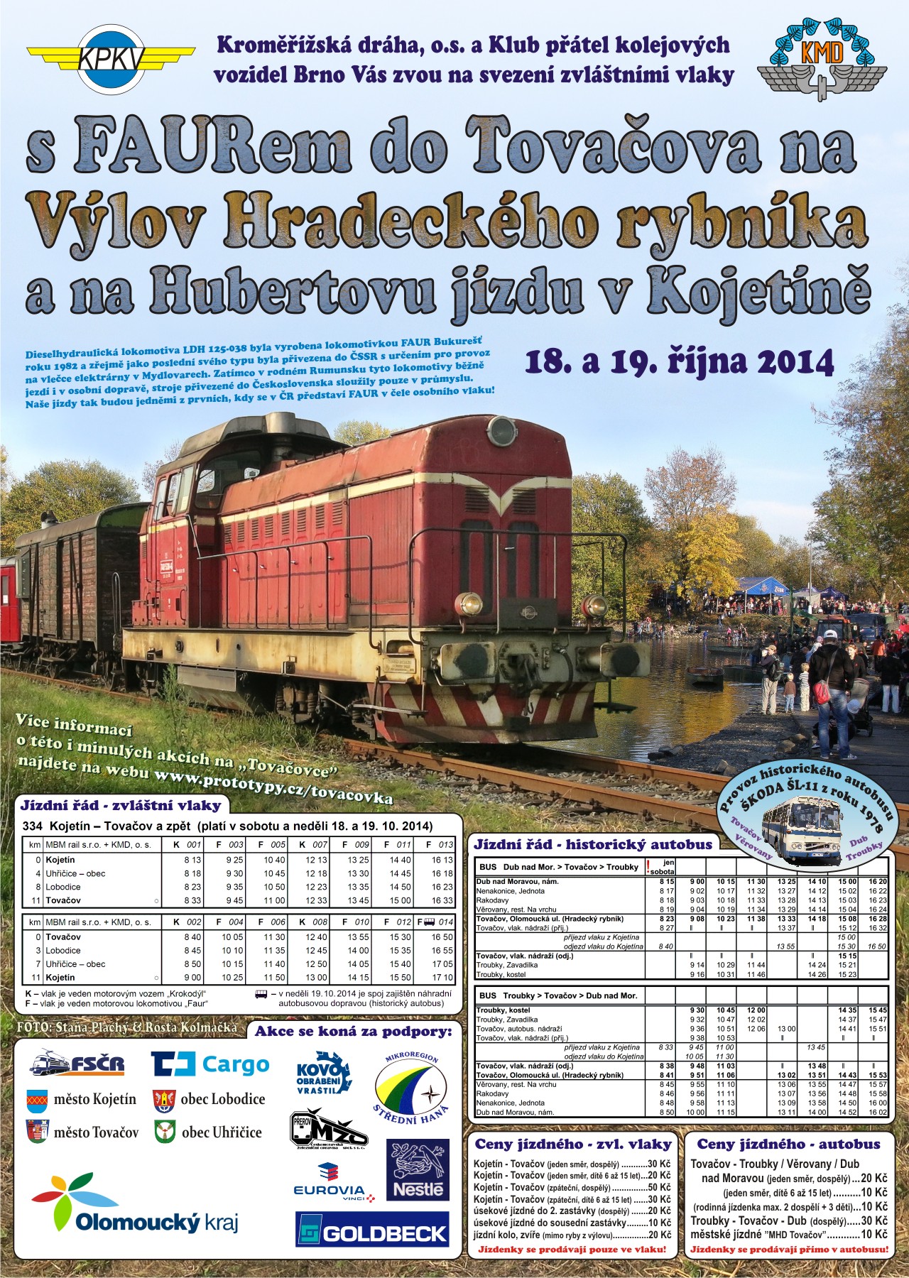 Také letos bylo možné se během víkendu zúčastnit dalších doprovodných akcí. Pro milovníky koní byl v Kojetíně letos pořádán již 6. ročník Hubertovy jízdy. Za bývalou farmou Račová byla v 10 hodin odstartována soutěž po okružní trase louka za Račovou (bývalé závodiště) - Včelín - Myslivecká chata Uhřičice (přestávka na oběd) - Špalír - louka za Račovou. Po oba víkendové dny byla v provozu zvláštní autobusová linka Dub nad Moravou - Tovačov - Troubky kostel. Na této autobusové lince jezdil historický autobus ŠL-11 z roku 1978. Po celý víkend jezdily po trati Kojetín - Tovačov zvláštní vlaky, které každý den odvozily po sedmi párech zvláštních vlaků. Na trati se střídaly dvě soupravy ve složení motorová lokomotiva LDH 125-038 „Faur” se dvěma vozy Bix a služebním vozem Daa-k a a samotný motorový vůz M286.0044 „Krokodýl”. Ten byl po oba dny nasazen na prvním ranním obratu 001/002 (Os 31252/Os 31253) a poledním 007/008 (Os 31258/Os 31259). Na posledním nedělním vlaku O14 (Os 31265) z Tovačova do Kojetína měl být nasazen historický autobus jako NAD, protože souprava vlaku měla zůstat v Tovačově na vlečce Toposu. Ovšem kvůli technologickým záležitostem plánované výluky byla souprava převezena do Chropyně. Po příjezdu Os 31264 do Tovačova a přípravě soupravy odjel vlak jako Sv přibližně v 17:05 do Kojetína. Tam byla souprava doplněna o motorový vůz M286.0044 „Krokodýl” a celá souprava přejela už za tmy do Chropyně. Pro letošní poslední jízdy na Tovačovce jsem měl plánovány oba víkendové dny. Počasí bývá v tuto roční dobu oblasti kolem Tovačova plné rybníků a jezer dosti vrtkavé a doprovázené častými mlhami, které setrvávají až do poledne. To se nakonec také potvrdilo. Zatímco v sobotu převládalo převážně slunečné počasí s občasnými mraky, které poněkud pozlobily fotografy přítomné podél celé trati, v neděli panovalo typické počasí, jak ho známe z Tovačovky z uplynulých let. Hustá mlha doprovázená nepříjemným chladem a žádný vítr. Ostatně jako v minulých letech se slunce probojovalo přes mlhu až před polednem a zasvítilo nám až na vlak 007 (Os 31257) projíždějící bývalou zastávkou Oplocany. Na zdokumentování jízd zvláštních vlaků jsem volil klasická místa v okolí Tovačovky a v neděli navíc s kompromisem kvůli nízké dohlednosti v mlze. Na závěr nechybí v záběrech ani odjezd posledního nedělního vlaku Os 176219 z Tovačova za účelem odvozu soupravy do Chropyně. Bohužel další doplnění soupravy v Kojetíně se protáhlo až do setmění a záběr pořízený za Kojetínem u mostu přes Moravu byl už nepoužitelný. O zdárný průběh celé akce se opětovně starali členové občanského sdružení Kroměřížská dráha (KMD). Ve vlacích bylo také možné zakoupit drobné propagační materiály. Vozbu vlaků zajistily po oba dny hnací vozidla Klubu přátel kolejových vozidel Brno (KPKV). Těmito podzimními jízdami pro letošní rok skončil bohatý provoz zvláštních vlaků na Tovačovce. Další informační zdroje: