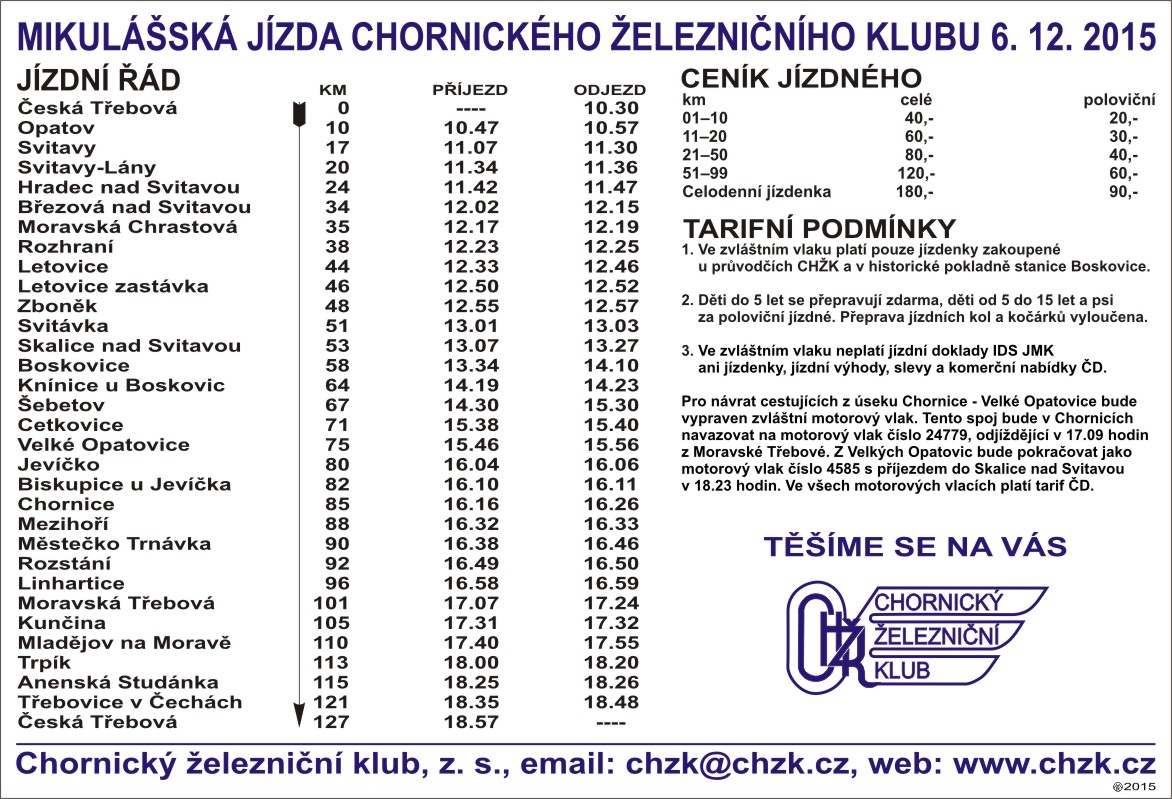 Celodenní jízda Mikulášského parního vlaku začíná v 10:30 v České Třebové a nejdříve parní vlak zamíří po koridorové trati 260 do stanice Skalice nad Svitavou, kde odbočí na lokální trať 262 směrem na Boskovice. V pozdním odpoledni projede úsek z Velkých Opatovic do Chornice, kde v současnosti není provozována pravidelná osobní doprava. V Chornici se parní vlak dostane na trať 017, po které zamíří zpět do České Třebové, kam dorazí až večer v 18:57. Během jízdy Mikulášský parní vlak urazí krásných 127 km a bude stavět ve všech stanicích a významných zastávkách. Navíc bude v Šebetově během hodinového pobytu od 14:30 do 15:30 připraveno občerstvení. Mimoto bude ve vlaku zařazen bufetový vůz a občerstvení tak bude k dispozici po celý den. Vlakem bude doprovázen Mikulášskou družinou a Chornický železniční klub zajistí doprovod vlakovým personálem v dobových uniformách z roku 1934. Také tato Mikulášská parní jízda postrádala to pravé sváteční kouzlo v podobě bíle zasněžené krajiny. Přesto tato v regionu již poslední letošní jízda parního vlaku přilákala také mnoho fanoušků železnice. Jízdu z České Třebové do Skalice nad Svitavou komplikovala pouze zpoždění pravidelných vlaků, které tak způsobovaly zpoždění našeho sledovaného Mikulášského parního vlaku. Ve větších stanicích však byly naplánovány dostatečně dlouhé pobyty a tak se podařilo před odjezdem ze Skalice nad Svitavou v 13:27 zpoždění eliminovat. Mnohé pobyty ve stanicích však byly důležité i z provozních důvodů. Bylo nutné parní lokomotivu promazávat a zbrojit vodou z hasičské cisterny. Mikulášský vlak neměl postrkovou lokomotivu a ta největší stoupání ze Skalice nad Svitavou po lokálce směrem na Boskovice a Šebetov byly teprve před námi. V Šebetově bylo připraveno občerstvení a horké nápoje, které byly velmi žádané. Vždyť venkovní teplota v tu dobu nepřekračovala 3 °C. Škoda jen, že parní vlak vyjížděl z České Třebové relativně pozdě až v 10:30. Na lokálku tak zamířil až o půl druhé a na úsek bez pravidelné osobní dopravy Velké Opatovice - Chornice se dostal až za soumraku. Velký zlom počasí byl patrný při pobytu v Šebetově. Zatímco přijíždějící parní vlak byl vidět v dáli, jak zdolává stoupání od Knínic u Boskovic do Šebetova, tak během hodinového pobytu se z okolních polí přivalila mlha, kterou nerozehnal ani studený vítr. Odjezd parního vlaku v 15:30 už byl za nevyhovujících světelných podmínek a stejně tak záběr z nedostavěné Hitlerovy dálnice A88 Vídeň - Vratislav za stanicí Velké Opatovice. Pro ty, kteří se chtěli svézt parním vlakem směrem na Chornice a případně dále, byl připraven zvláštní vlak Os 10107 navazující ve stanici Chornice na pravidelný Os 24779 s odjezdem v 17:09 z Moravské Třebové směr Chornice a Dzbel. Tento Os 10107 pokračuje dále ze stanice Velké Opatovice jako Os 4585 do Skalice nad Svitavou. Několika záběry jsme zdokumentovali jízdu Mikulášského parního vlaku po koridorové trati 260. I v neděli byla na trati kromě pravidelné osobní dopravy relativně silná nákladní doprava a parní vlak se svým rychlostním omezením 50 km/h musel ve stanicích vyčkávat na uvolnění trati. Jak jsme zmínil, během další jízdy ze Skalice nad Svitavou čekaly na parní vlak skupinky železničních nadšenců. Bohužel fotograficky použitelné podmínky končily právě v Šebetově. Z dalších záběrů se toho moc vybrat do reportáže nedalo a na zastávce v Linharticích jsme putování za Mikulášských parním vlakem ukončili. Další informační zdroje: