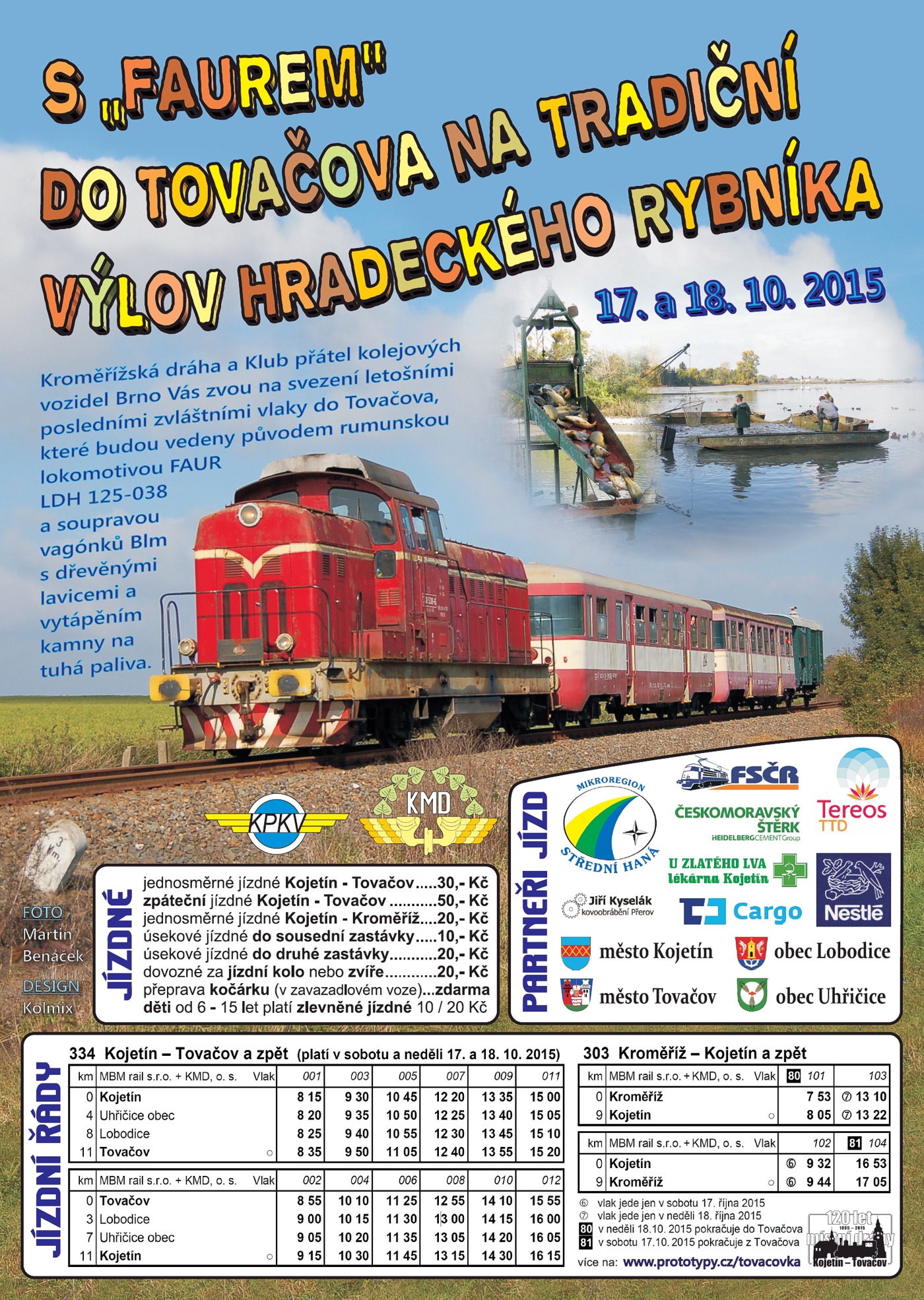 Jak bývá tradicí, na trati se při zvláštních akcích objevují různé zajímavé soupravy vlaků. Pro letošní jízdy byla původně plánovaná a na plakátech ohlášená lokomotiva LDH 125-038 „Faur”, která už jezdila v loňském roce na stejné akci se soupravou dvou vozů Bix a služebním vozem Daa-k. Tato souprava se na trati střídala s motorovým vozem M286.0044 „Krokodýl”. Pro mnoho železničních fanoušků byla lokomotiva LDH 125-038 „Faur” příjemným překvapením pro její zajímavý zvuk motoru. Bohužel kvůli vážné technické závadě nebylo možné lokomotivu však před termínem konání akce zprovoznit a na poslední chvíli byla ohlášena změna v nasazení vozidla. V čele zvláštních vlaků měla stanout lokomotiva řady 740. Ani ohlášená 740 899-0 se však na trať nakonec nedostala a v sobotu ráno přijela lokomotiva 740 770-3. Doprava byla posílena i v úseku Kroměříž - Kojetín o jeden pár vlaků vedený motorovým vozem M131.1454 „Hurvínek”. Pro cestující na výlov do Tovačova nebyla změna hnacího vozidla až tak podstatná. Souprava vlaku byla tvořena dvěma vozy Blm s kamínky na tuhá paliva, jedním vozem Blm, který dovezl M131.1454 „Hurvínek” z Kroměříže, a služebního vozu Daa-k. Na letošní poslední jízdy na Tovačovce jsem se vypravil až v neděli. Počasí opět nezklamalo. V tuto roční dobu a v této oblasti plné rybníků a jezer bývají ranní mlhy časté a mnohdy se rozplynou až před polednem. Nejinak tomu bylo i letos. V sobotu bylo počasí poněkud přívětivější bez mlh, ale i bez sluníčka. Naopak nedělní mlha trvající až do oběda se poté definitivně rozpustila a odpoledne se na chvíli objevilo i to vytoužené sluníčko. I přes celkovou nepřízeň počasí byly vlaky hojně využívány. V sobotu je bylo možné využít i v obrácením směru z Tovačova do Kojetína na již 7. ročník Hubertovy jízdy. O zdárný průběh celé akce se opětovně starali členové občanského sdružení Kroměřížská dráha (KMD). Ve vlacích bylo také možné zakoupit drobné propagační materiály. Těmito podzimními jízdami pro letošní rok skončil bohatý provoz zvláštních vlaků na Tovačovce a na další jízdy si musíme počkat až do května příštího roku. Další informační zdroje: