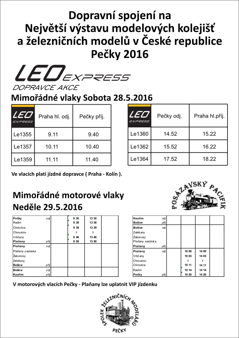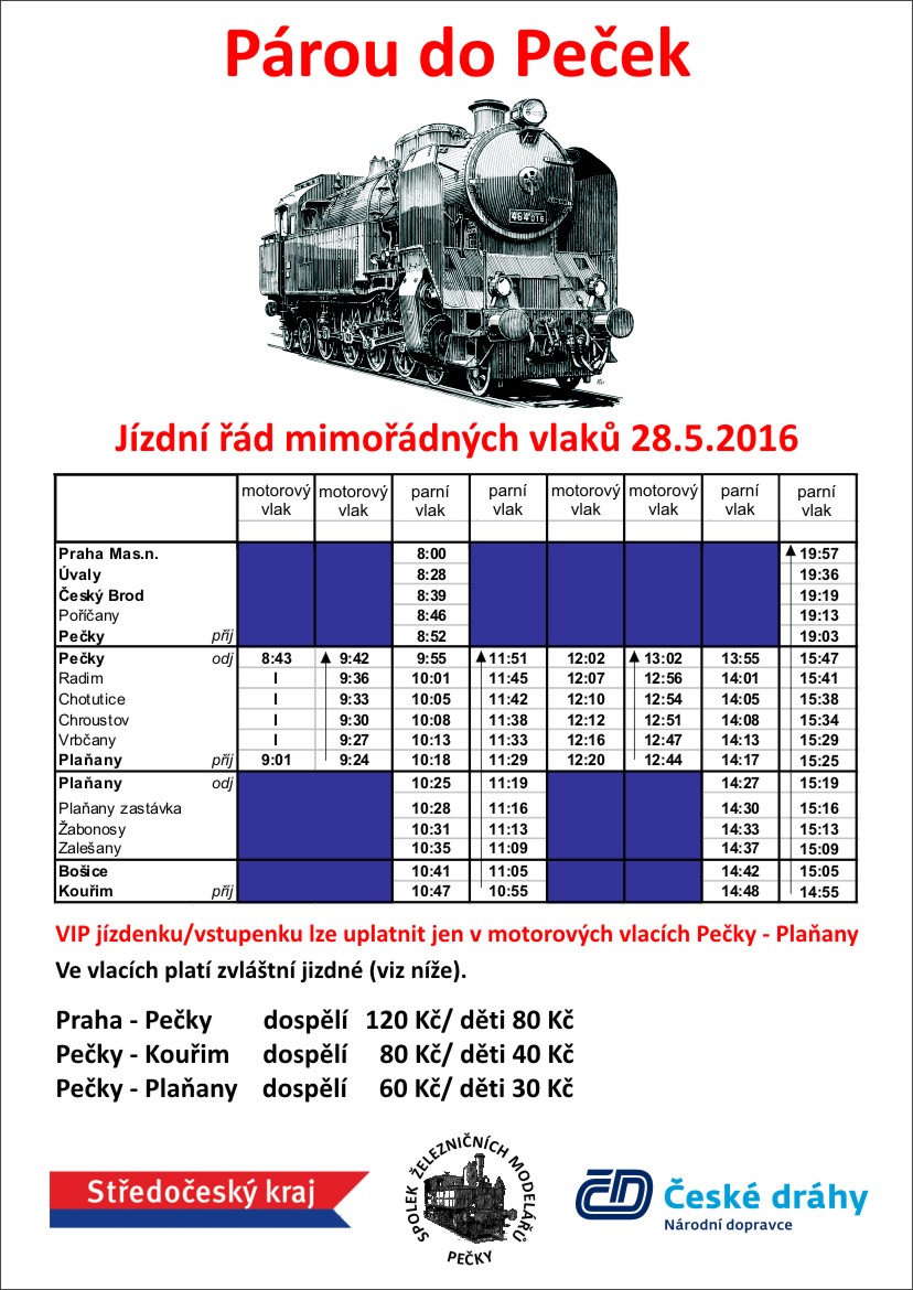 Nejdříve jak byly naplánovány jízdy zvláštních vlaků? Ty byly rozvrženy do obou víkendových dní, avšak hlavním magnetem byly sobotní jízdy parního vlaku vedeného parní lokomotivou 464.008 „Bulík” po lokálce z Peček do Kouřimi. Ostatní jízdy motorových vlaků byly zajištěny spolkem „Posázavský Pacifik“, který přijel z Benešova se soupravou vedenou dvěma motorovými lokomotivami „Hektor“ T435.003 a T435.0509. Vozby sobotních čtyřech párů vlaků vypravených z Peček se měly střídavě zhostit motorová lokomotiva T435.003 „Hektor“ a parní lokomotiva 464.008 „Bulík”, přitom lokomotiva T435.003 měla vypomáhat na postrku obou párů parních vlaků. A jaká byla skutečnost? První ranní obrat vlaků Os 740/Os 741 z Peček do Plaňan proběhl bez problémů. Zvláštní vlak odvezla lokomotiva T435.003 „Hektor“, zatímco druhá lokomotiva T435.0509 zůstala v Pečkách a jezdila po bývalé vlečkové koleji. Mezitím měl z Prahy dojet zvláštní parní vlak vedený lokomotivou 464.008 „Bulík”, aby jako Os 10742 pokračoval z Peček do Kouřimi. Parní vlak však nikde a místo toho jsme se dozvěděli nemilou zprávu, že zvláštní vlak Os 10739 teprve vyjel z Prahy se zpožděním nějakých 100 minut. Operativně tak na druhý pár vlaků Os 10742/Os 10743 z Peček do Kouřimi odvezla stejná souprava motorového vlaku. O zážitek z jízdy parního vlaku jsme naštěstí nebyli nakonec připraveni. Třetí pár vlaků Os 10744/Os 10745 z Peček do Plaňan odvezla parní lokomotiva 464.008 „Bulík” sama a o vozbu čtvrtého páru vlaků Os 10746/Os 10747 z Peček do Kouřimi se podělily obě lokomotivy. Směrem do Kouřimi jela v čele zvláštního vlaku Os 10746 dieselová lokomotiva T435.003 „Hektor“ a při zpáteční jízdě parní lokomotiva 464.008 „Bulík”. Tím byly jízdy zvláštních vlaků pro sobotu téměř vyčerpány. Zbýval ještě odjezd parního vlaku Os 10748 v 19 z Peček do Prahy. Další odpolední čas původně plánovaný na návštěvu výstavy zhatilo počasí. Už jízdu posledního zvláštního vlaku Os 10747 z Kouřimi do Peček popoháněla od jihovýchodu blížící se fronta doprovázená blesky nad horizontem a povážlivými těžkými mraky. Do deseti minut po příjezdu vlaku do Peček se spustilo krupobití. Následoval plošný výpadek elektřiny, mobilního signálu a lokální záplavy. Sobotní podvečerní program akce tak „Jede, jede mašinka“ byl definitivně zpečetěn. Krátký reportík nabízí průřez jízdami zvláštních vlaků na lokálce z Peček do Kouřimi a něco málo doplněno z průjezdů pravidelných vlaků. Nemohou chybět záběry z oblíbeného místa u Vrbčan. S ohledem na změny v nasazení vozidel na dalších vlacích bylo nutné s volbou dalších míst improvizovat. Navíc trať v rovinatých úsecích byla už v tomto ročním období dost zarostlá a mnohá zajímavá místa tak byla nepoužitelná. Další informační zdroje: