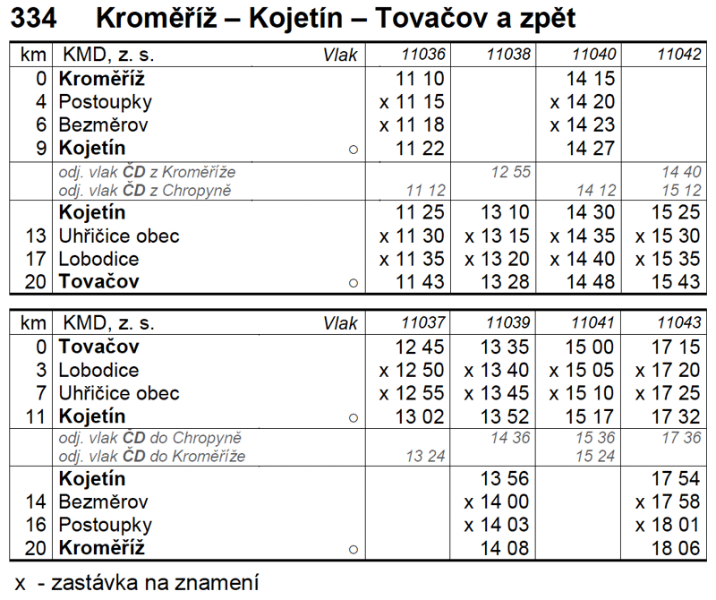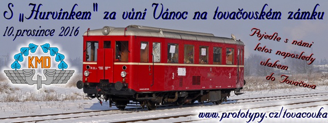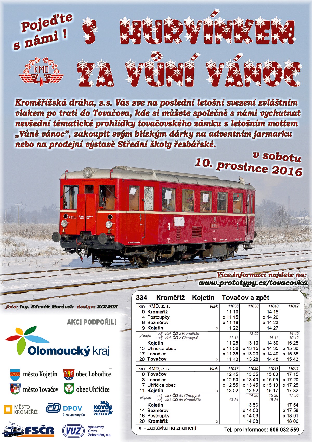 Vánoční akce na zámku Tovačov o víkendu 10. a 11. prosince měly společné motto - „Vůně Vánoc“. Pro sváteční prohlídky byl zámek Tovačov svátečně vyzdoben a provoněn kořením a purpury. Sváteční atmosféra adventu dýchala už při vstupu na nádvoří, kde každoročně bývá historický jarmark, doprovodné akce a samozřejmě občerstvení. Jízdy zvláštních vlaků na trati Kroměříž - Kojetín - Tovačov byly letos další z doprovodných akcí. Návštěvníci, kteří přijeli do Tovačova vlakem, se mohli hned naproti nádraží podívat na prodejní a prezentační výstavu Střední školy řezbářské. V sobotu 10. prosince byly na trať mezi Kojetínem a Tovačovem vypraveny celkem 4 páry zvláštních vlaků, vše v režii motorového vozu M131.1454 „Hurvínek“. Z kapacitních důvodů samotného motorového vozu byla omezena přeprava kočárků. Motorový vůz „Hurvínek“ vyjížděl v 11:10 jako Os 11036 ze stanice Kroměříž a následně při dalších z Tovačova zajížděl na obraty střídavě do Kojetína a do Kroměříže. Pohled na jízdní řád ubezpečuje, že pro návštěvu zámku v Tovačově je dostatek času i mezi obraty některých vlaků, konkrétně Os 11036/11037 a Os 11042/11043. Zvláštní vlaky budou zajišťovat dopravu až do večera a motorový vůz M131.1454 „Hurvínek“ se vrátí do Kroměříže až v 18:06, kde zůstává v tamní remíze. Využili jsme podzimního dne ke zdokumentování posledních letošních jízd po trati Kojetín - Tovačov a také k návštěvě zámku Tovačov. Bohužel ani náznak sněhu, který by vylepšil slavnostní atmosféru adventu. Zatímco při dopoledních jízdách zvláštních vlaků bylo vysloveně pošmourno a pofukoval nepříjemný větřík, odpoledne se obloha postupně protrhávala až na polojasno. Tepleji nám sice nebylo, ovšem záběry díky nízkému slunci získaly příjemný barevný nádech. Kdo z železničních fanoušků tak vydržel až do odpoledne, mohl být se záběry spokojen. Při posledním obratu v Tovačově mezi Os 11042 a Os 11043 jsme čas využili návštěvou jarmarku a občerstvením na nádvoří zámku v Tovačově. Odjezd posledního Os 11043 v 17:15 z Tovačova však kvůli tmě již nebyl dokumentovatelný. Další informační zdroje: