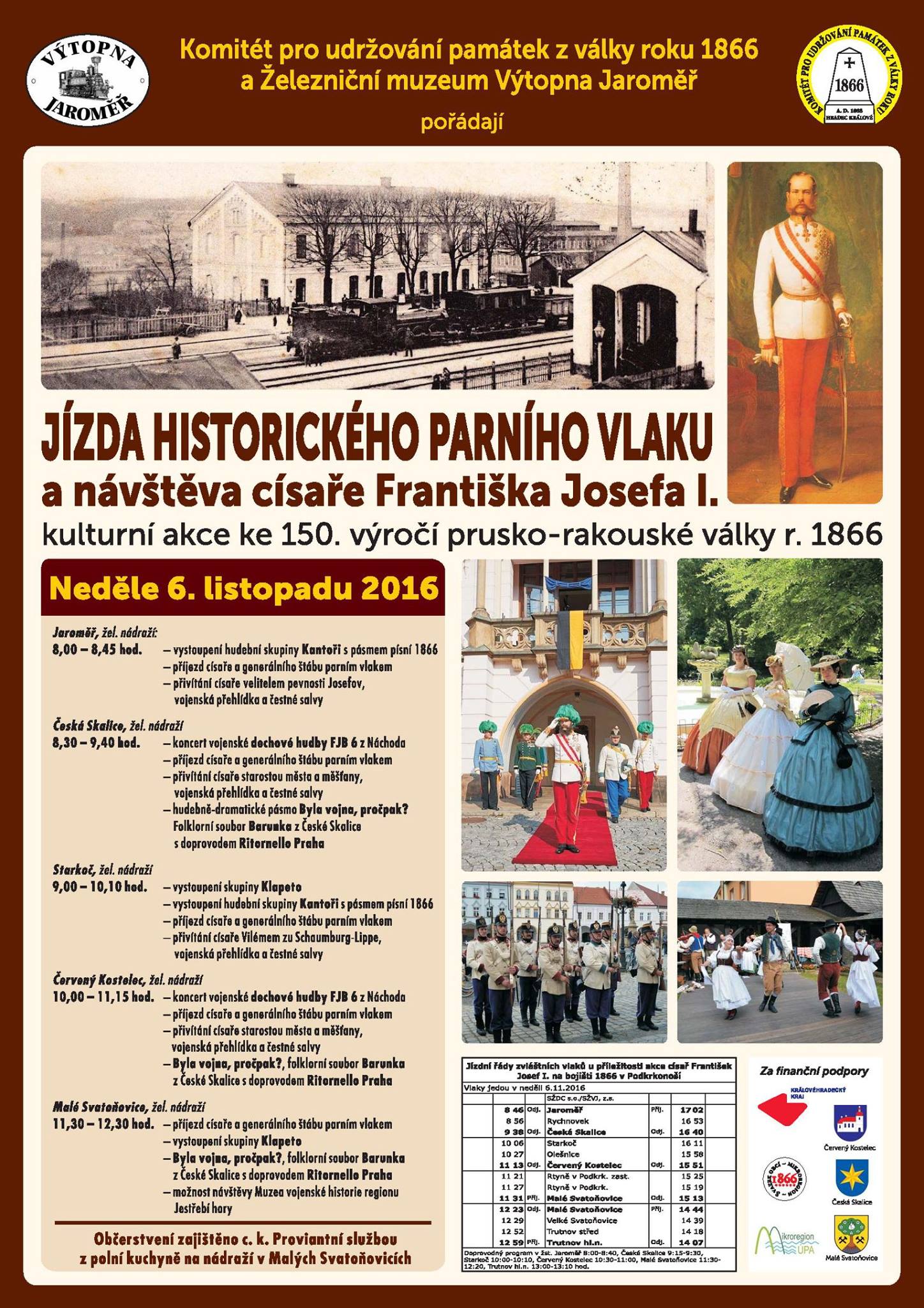 Železniční muzeum výtopna Jaroměř připravilo na první listopadový víkend jízdy zvláštních vlaků s parní lokomotivou u příležitosti návštěvy císaře Františka Josefa I. na bojištích války prusko-rakouské 1866. V sobotu 5. listopadu byly vypraveny dva páry parních vlaků z Jaroměře do Hradce Králové u příležitosti akce „Návštěva císaře Františka Josefa I. na bojišti 1866 Chlum u Hradce Králové“ s doprovodným programem v Hradci Králové při prvním dopoledním obratu parního vlaku. V neděli 6. listopadu byl vypraven parní vlak na trati Jaroměř - Starkoč - Trutnov hl.n. u příležitosti akce „Císař František Josef I. na bojišti 1866 v Podkrkonoší“ s doprovodným programem při pobytu parní ho vlaku ve stanicích Jaroměř, Česká Skalice, Starkoč, Červený Kostelec, Malé Svatoňovice a Turnov hl.n. při jízdě směrem tam. To bylo seznámení s hlavním víkendovým programem. Navíc bylo možné se svézt parním vlakem v pátek a v pondělí, ovšem vždy jen jednosměrně. V pátek 4. listopadu byl v 10:51 vypraven parní vlak Os 10701 z Turnova do Jaroměře v sestavě parní lokomotiva 310.0134 + služební vůz + jeden osobní vůz typu „Rybák“. V pondělí 7. listopadu se stejný parní vlak vydal v 8:20 zase na zpáteční jízdu z Jaroměře do Turnova. V připraveném plakátku jsou podrobně rozepsány přípojné vlaky ČD ve směru do Jaroměře a Turnova. Krátká reportáž dokumentuje jen páteční jízdu zvláštního parního vlaku Os 10701 z Turnova do Jaroměře. Reportáž je doplněna o několik záběrů parní lokomotivy 310.0134 „Litovel“ před výjezdem z prostor depa a také o záběry pravidelných vlaků na trati 040 Turnov - Jaroměř, se kterými musel tento parní vlak vykřižovat. Vždyť ve srovnání s pravidelnými vlaky, které tento úsek trati v délce 84km ujedou za zhruba 2 hodiny (jako Os) nebo 1,5 hodiny (jako R), trvala parnímu vlaku jízda se všemi nutnými pobyty zhruba 4 hodiny. Další informační zdroje: