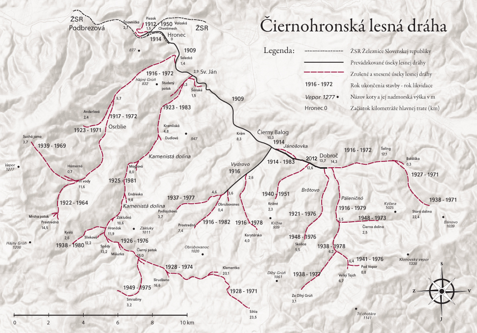 Doprava dřeva z Horehroní byla po několik století doménou vodních toků. Stávající bystřiny v okolních údolích nebyly pro splavování dřeva moc vhodné. Bylo nutné koryta upravovat a budovat vodní nádrže k zajištění dostatku vody pro splavení vytěženého dřeva, kulatiny, spíše kratších polen. Úzkorozchodná železnice s rozchodem 750 mm si vydobyla svoje místo již v roce 1878 při dopravním spojení mezi železárnami v Podbrezové a slévárnou v Hronci. Původní plány lesní železnice počítaly s vybudováním spojení mezi pilami v Čiernom Balogu a Hronci a s napojením na normálněrozchodnou železnici v Podbrezové. První část trati z Čierneho Baloga do Hronca byla dána do provozu v roce 1909 a železnice měla maďarský název Feketegaramvölgyi Vasút (F.G.V.), přeloženo jako „Dráha v údolí Čierného Hronu“. Následná dostavba trati z Hronca do Podbrezové si vyžádala změnu v projektu. Kvůli rozvoji hutí v Podbrezové došlo mezitím k posunutí železniční stanice a napojení lesní železnice kvůli stísněným podmínkám muselo být provedeno jinak. V roce 1910 byla z Chatimechu vybudována normálněrozchodná vlečka do Hronca vedená paralelně se zmiňovanou hutní úzkorozchodnou tratí a v Hronci bylo vybudováno překladiště mezi lesní železnicí a normálněrozchodnou vlečkou. Další rozšiřování sítě lesní železnice nebylo přerušeno ani během 1. světové války, kdy byli na zemních pracích nasazeni především váleční zajatci. V nově vniklé Československé republice byla lesní železnice přejmenována na Čiernohronskou lesní dráhu (Č.H.L.D.) a neustávalo ani budování dalších odboček do okolních údolí. Délka všech tratí lesní železnice dosáhla úctihodných 132 km. V letech 1927 - 1962 byla v úseku Čierny Balog - Hronec zavedena osobní doprava. Bohužel ani tato lesní dráha nemohla odolávat dostupné a operativní automobilové dopravě. Postupně v 60. letech začalo docházet k omezování provozu, redukci železniční sítě a 31. prosince 1982 byl provoz ukončen na zbývajících 36 km trati. Z nařízení vlády SSR měla být lesní železnice do konce roku 1985 kompletně zlikvidována. Ještě v roce 1982 se díky nadšencům podařilo lesní železnici zapsat na seznam státních kulturních památek. V roce 1983 vznikl ve Vydrovské dolině bezplatný pracovní tábor „Strom života“, jehož brigádníci pomáhají při obnově železničky. Slavnostní zahájení obnoveného provozu na lesní železnici, výletních vlaků pro veřejnost, bylo 1. května 1992. Centrum Čiernohronské železnice je v Čiernom Balogu, odkud jsou vypravovány výletní vlaky pro veřejnost. Pro letošní rok 2018 jsou v nabídce tyto vlaky: