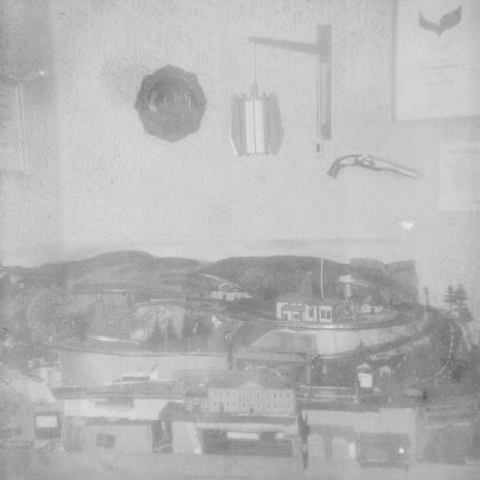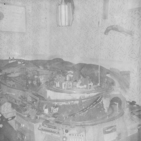 První kolejiště 70. a 80. létaÚplně první panel kolejiště byl na tehdejší dobu přepychový. Velikost 160x80cm, bytelná konstrukce se silným rámem vyztuženým žebry, nahoře základová deska z překližky. Veškeré kolejivo bylo plechové BTTB se standardním poloměrem oblouků 286mm. Výhybky byly tehdy jediné s úhlem odbočení 22st. Konečný stav kolejiště byl velmi maximalistický. Z hlavního nádraží vlevo končí dvoukolejná trať v tunelu, kde sestupuje až na základovou desku do vratné smyčky. Z nádraží vpravo se trať šplhá dvěma tunely a třemi oblouky do horní vratné smyčky, ve které je zároveň druhé, menší nádraží. Toto kolejiště vydrželo snad nejdéle a absolvovalo spoustu přebudování, než se dostalo do tohoto konečného stavu. Vždyť v té době nebylo nic problém, žádný oblouk nebyl dost malý a žádné stoupání dost velké. Dobové fotografie jsou jediné dochované. Byly foceny tehdejší novinkou, Polaroidem, který za malý okamžik po expozici vykouzlil hotovou fotku. Zachycen je panel kolejiště ještě v ranném stadiu různých pokusů a potom finální kolejiště "našlapané" všemi dosažitelnými novinkami.