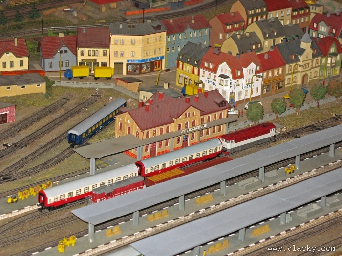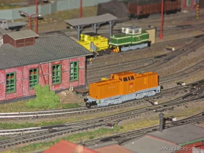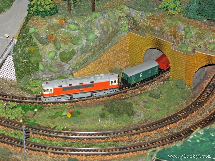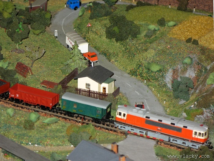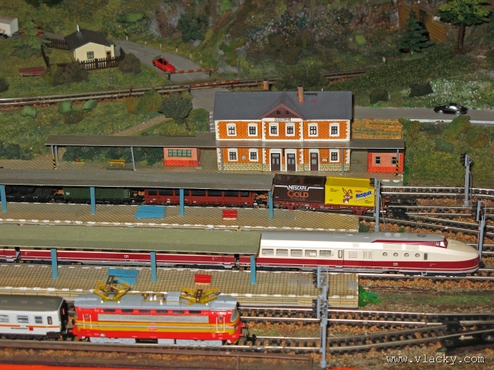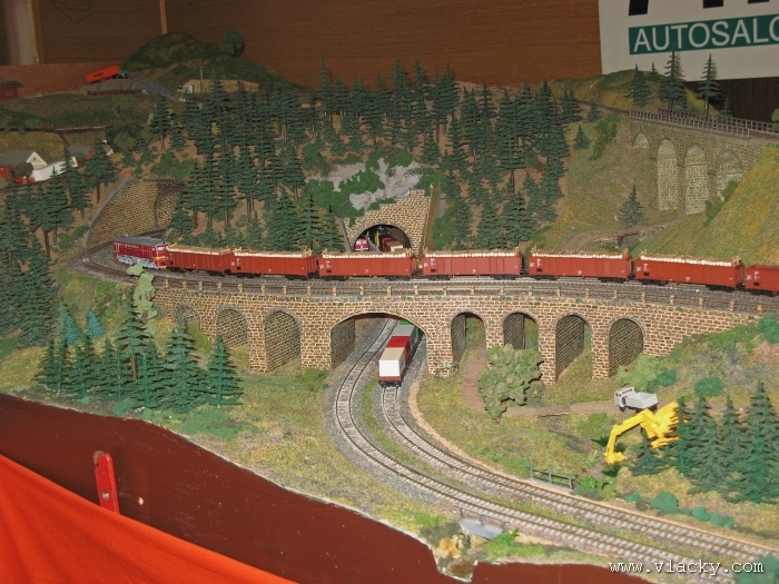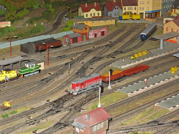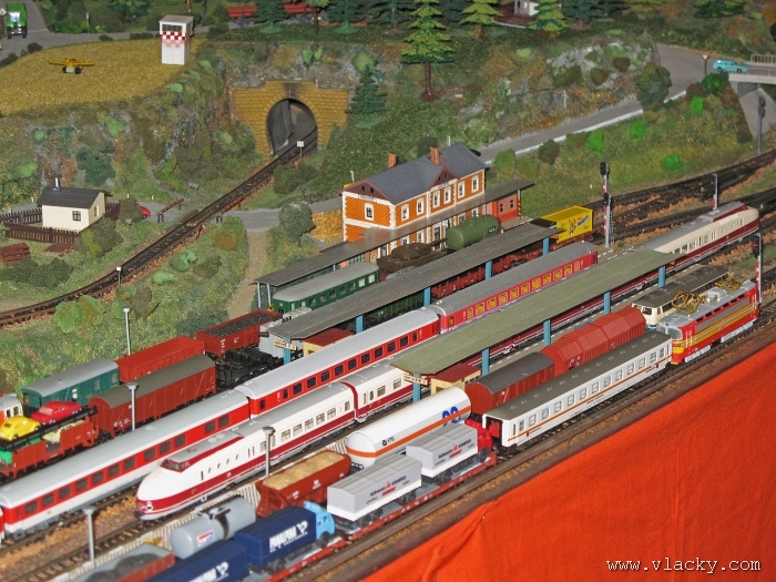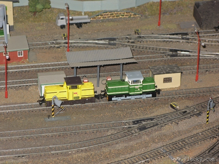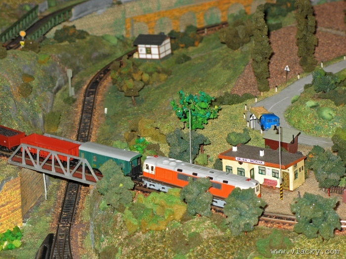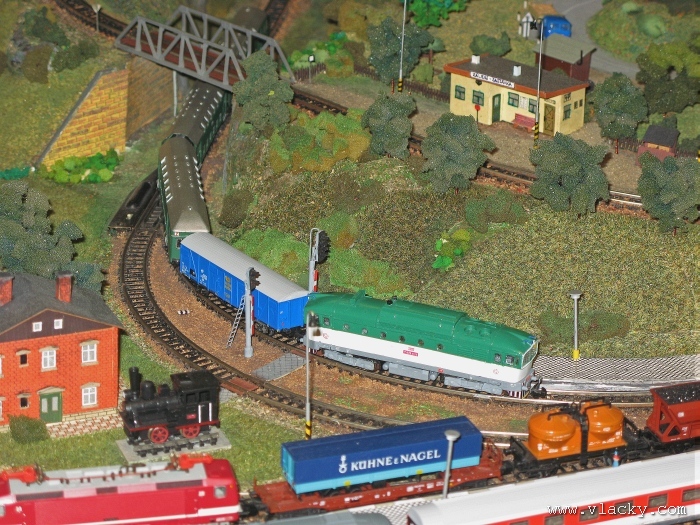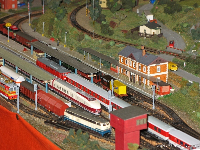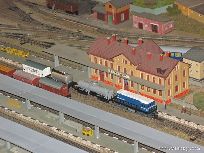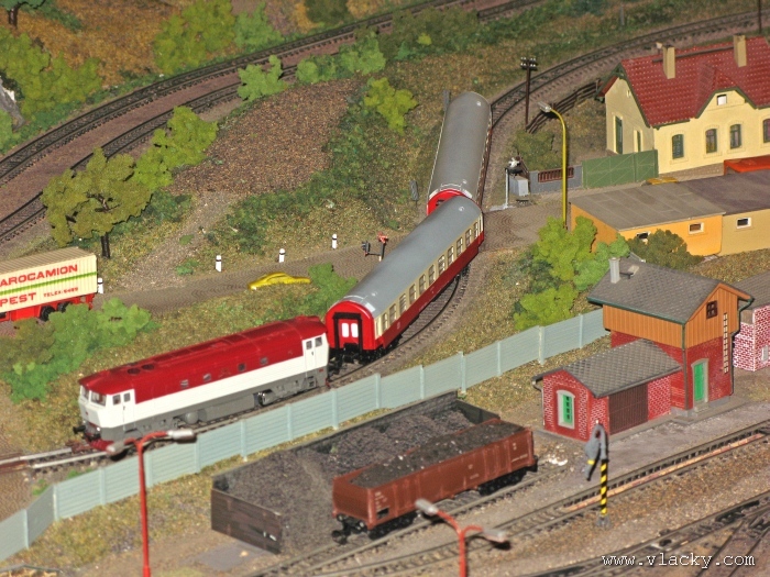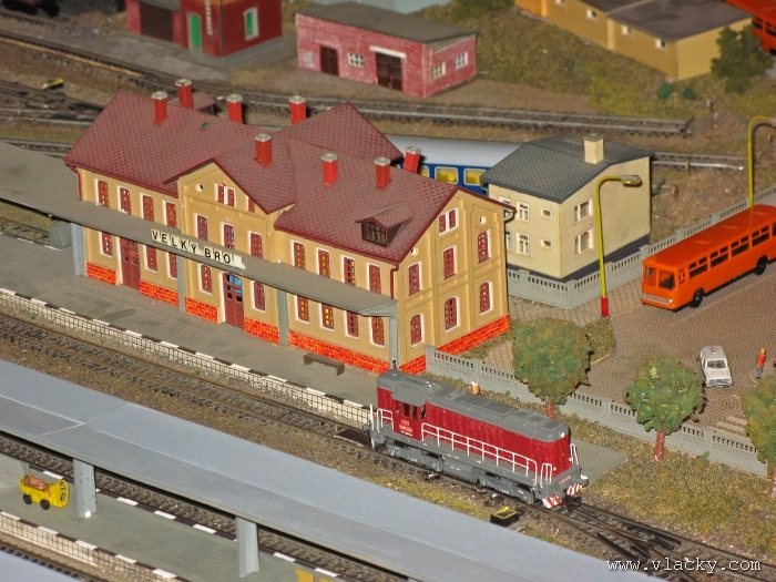 Zevrubnému popisu kolejiště jsem se věnoval již v loňské reportáži. Proto jsem se spíše zajímal o provoz na kolejišti a pokukoval jsem, zda-li se již modeláři pustili do modernizace hlavní stanice Velký Brod. Z vlastní zkušenosti nejde jen o prostou výměnu původného plechového kolejiva tvaru obráceného U za moderní profilové, ale zejména ve stanicích musí dojít při výměně výhybek ke změně geometrie zhlaví. Původní výhybky s úhlem odbočení 22,5 st. je nutné vyměnit za novější s úhlem odbočení 15 st. a menším. Jak je vidět např. na záběru levého zhlaví z minulé výstavy nebo aktuálnějšího pohledu z jiného úhlu, rekonstrukce bude určitě náročná. Z fotogalerie je patrné, že veškerý provoz na hlavní dvojkolejné trati i vedlejší jednokolejné byl zajišťován motorovou trakcí. Na dvojkolejce mohly soupravy vlaků jezdit opravdu v rychlém sledu. Provoz jednokolejné trati byl limitován kapacitními možnostmi trati, mezilehlé stanice Lhotka a koncové stanice Kopečná. Tentokrát jsem věnoval samostatnou fotogalerii i menšímu kolejišti v modelové velikosti N. S tímto kolejištěm jsem se setkal poprvé a snažil jsem se aspoň několika záběry přiblížit modelovaný námět. Jak už jsem zmínil při jiných výstavách, modelová velikost N umožňuje na stejném prostoru vymodelovat ze zvoleného námětu daleko větší výsek. Zároveň je však vhodné, aby návštěvník mohl takové kolejiště pozorovat zblízka a vychutnat si tak všechny detaily. V prostorách po levé straně byly navíc umístěny vitríny s výstavou modelů lokomotiv a vozů. Návštěvu výstavy mohu jen doporučit. Během mého asi dvouhodinového okukování v poledním čase nebyly u vystavovaných kolejišť žádné tlačenice a tak si každý návštěvník mohl výstavu vychutnat. Další informační zdroje: