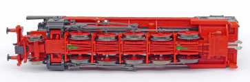 Popis   parní lokomotiva černá s červeným pojezdem a kouřovými plechy