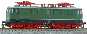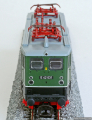 Popis   elektrická lokomotiva zelená s černým rámem, šedou střechou a červenými podvozky
